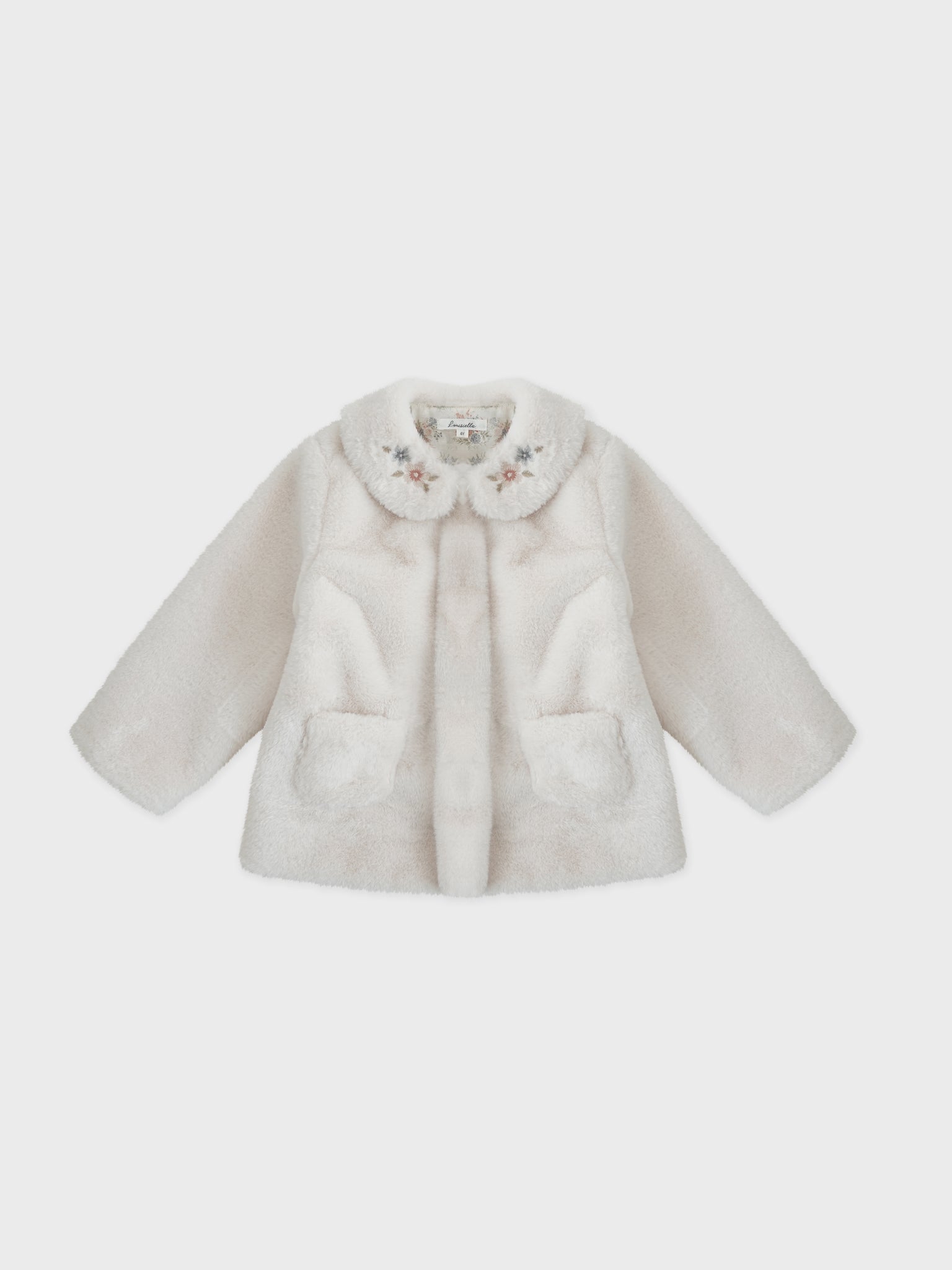 Manteau en fausse fourrure doux et confortable avec des détails en broderie vintage. Léger mais chaud, il est parfait pour les jours d'hiver.