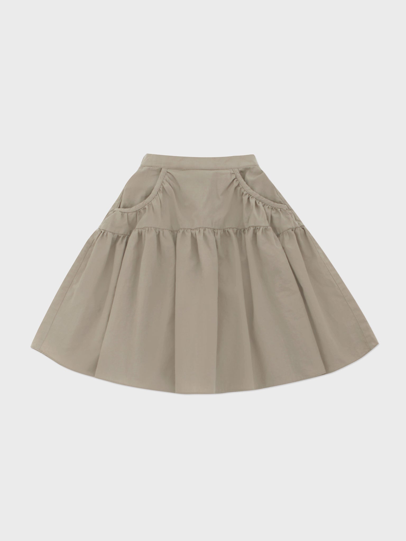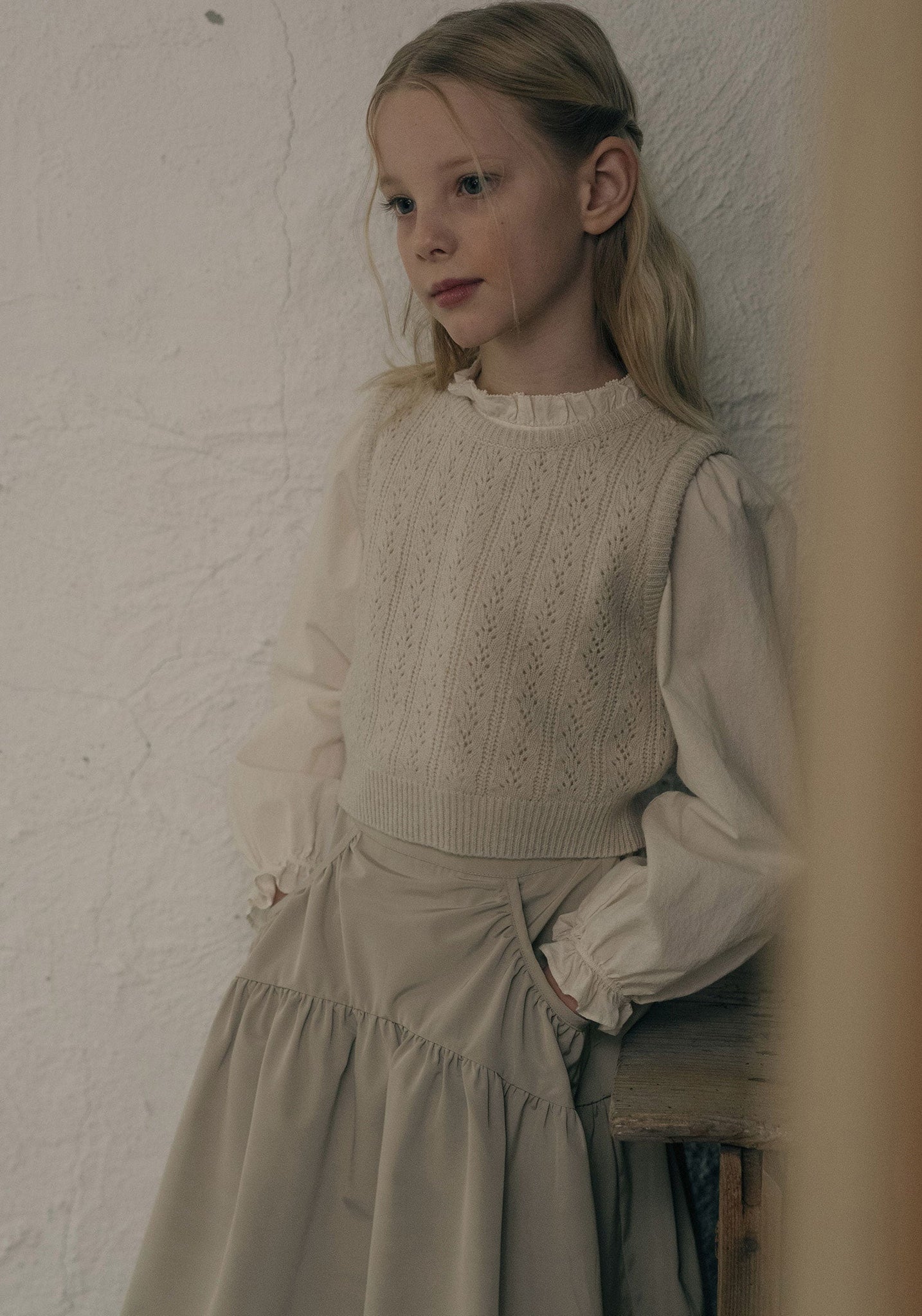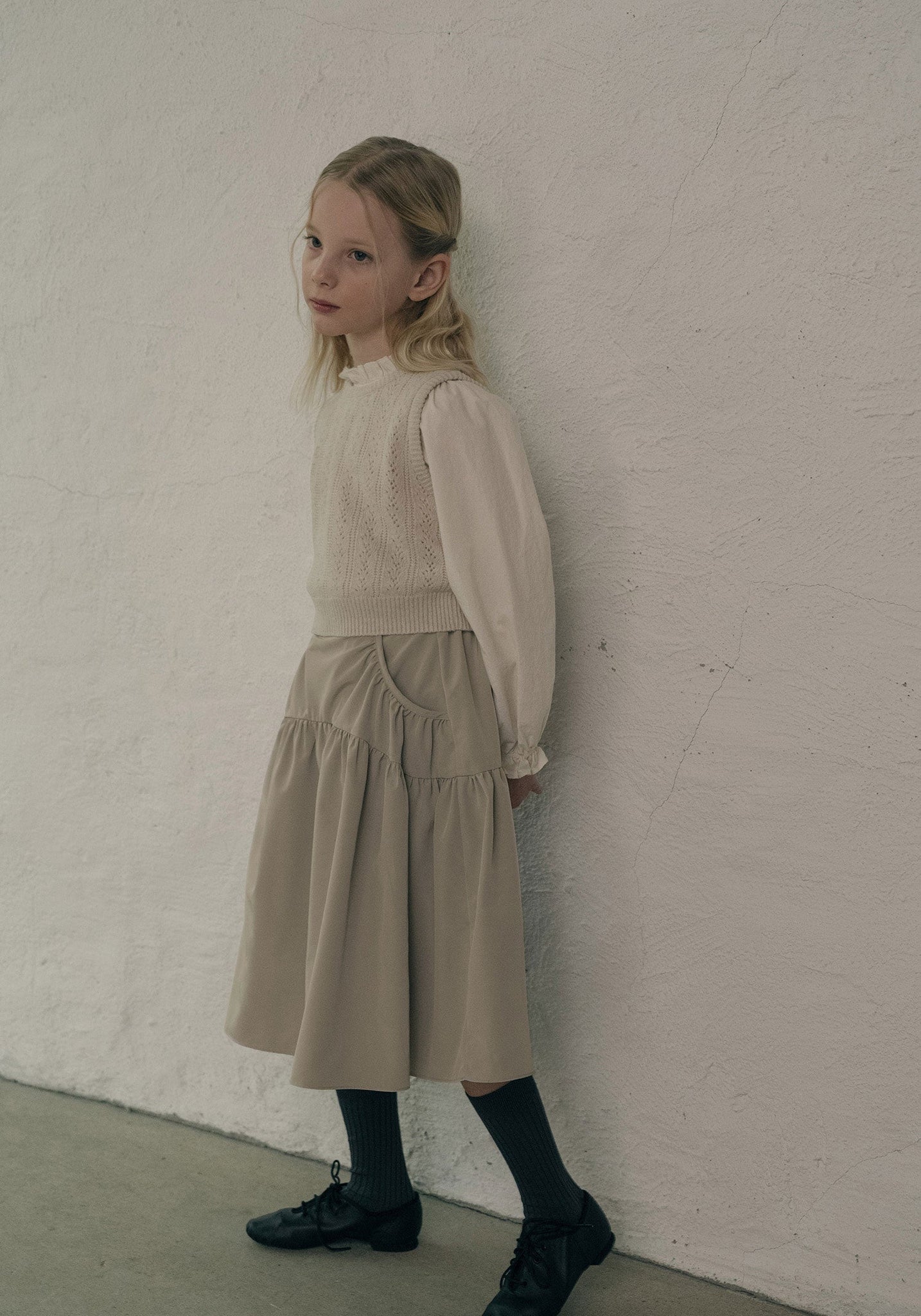 This unique girl's skirt design is the perfect addition to your young lady's holiday wardrobe. Featuring a flowy voluminous fit and a soft color, this skirt effortlessly creates a light and airy silhouette. Create an elegant outfit adequate for the holiday season with this knee-length skirt and our Mielle Blouse.