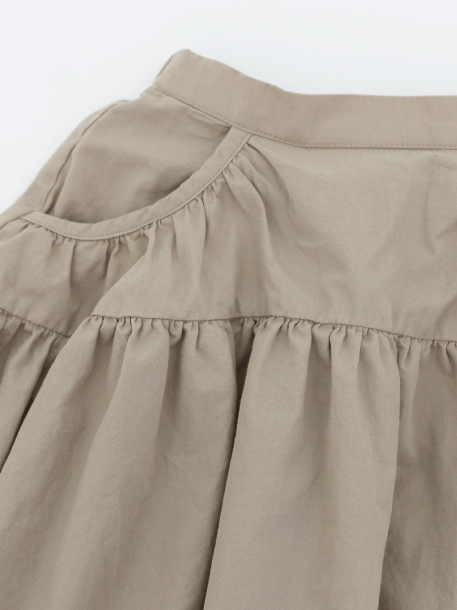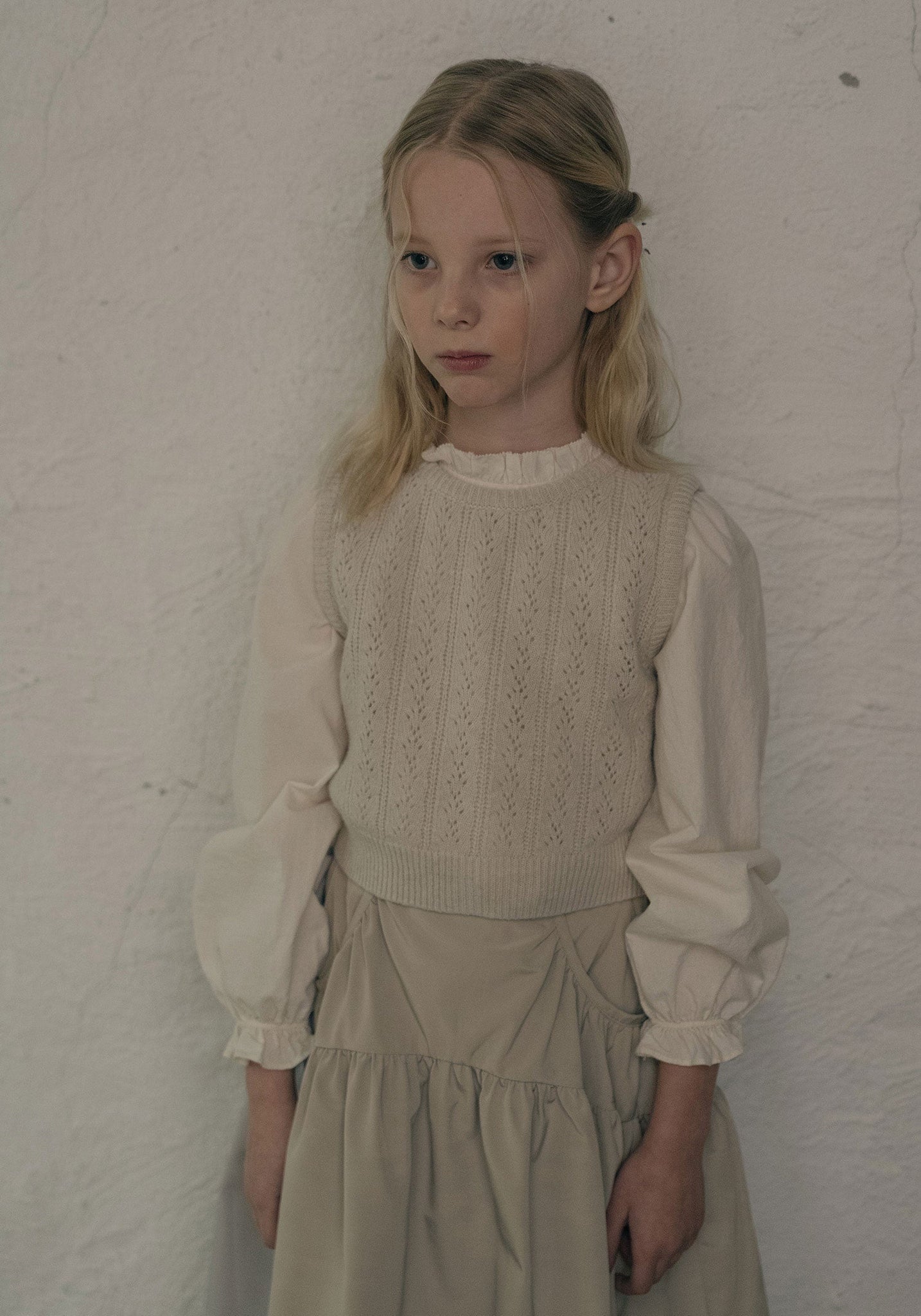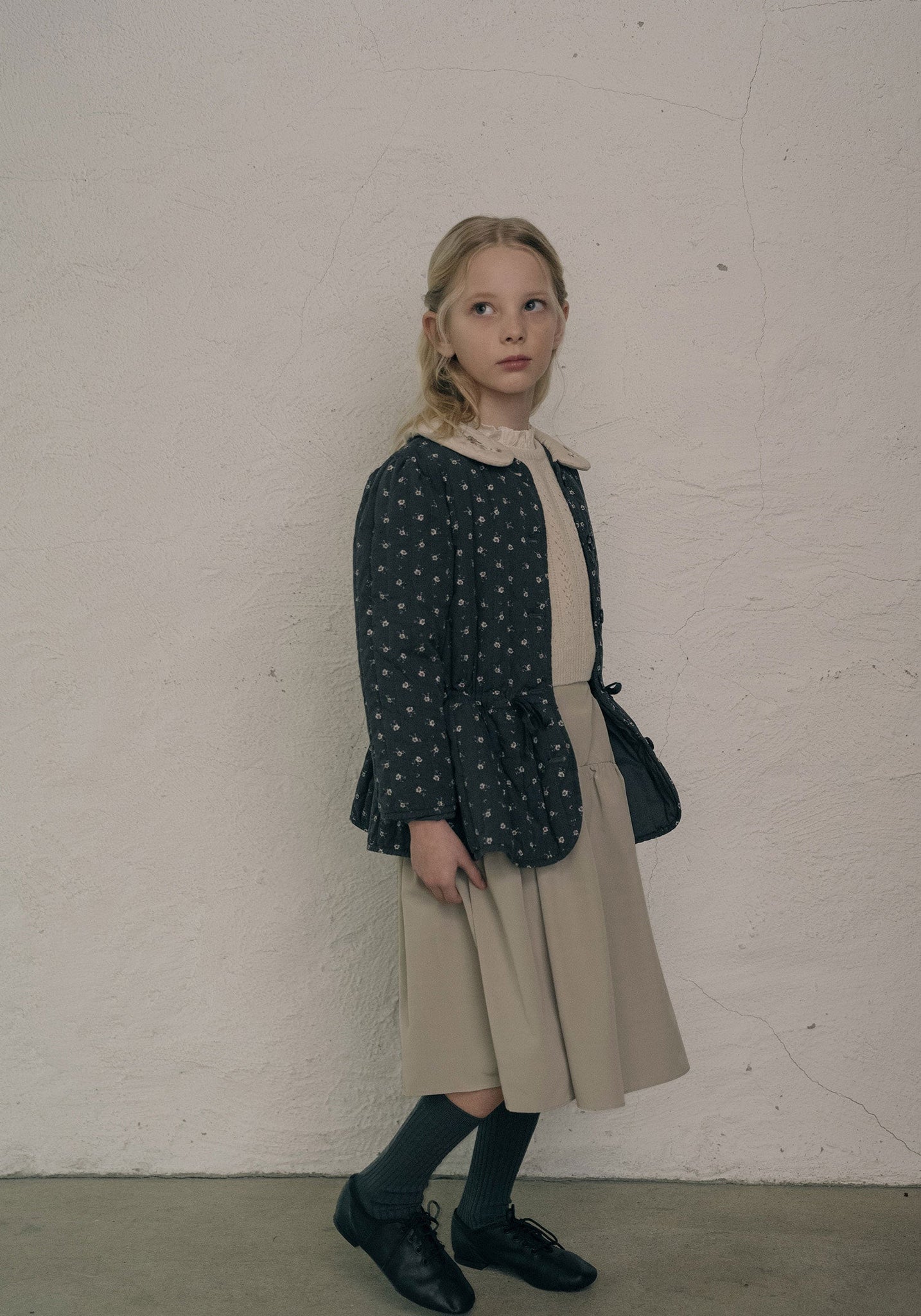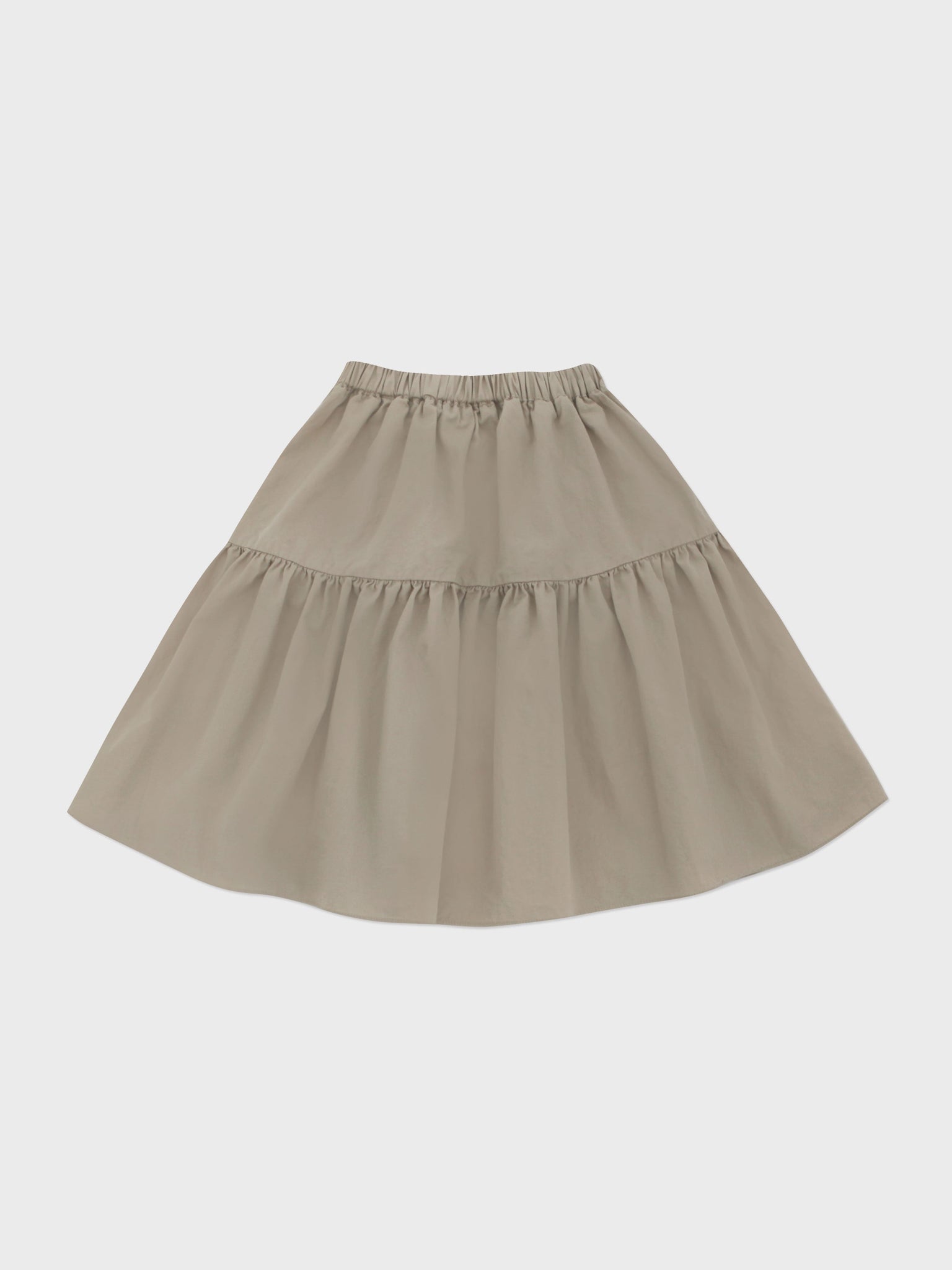 This unique girl's skirt design is the perfect addition to your young lady's holiday wardrobe. Featuring a flowy voluminous fit and a soft color, this skirt effortlessly creates a light and airy silhouette. Create an elegant outfit adequate for the holiday season with this knee-length skirt and our Mielle Blouse.