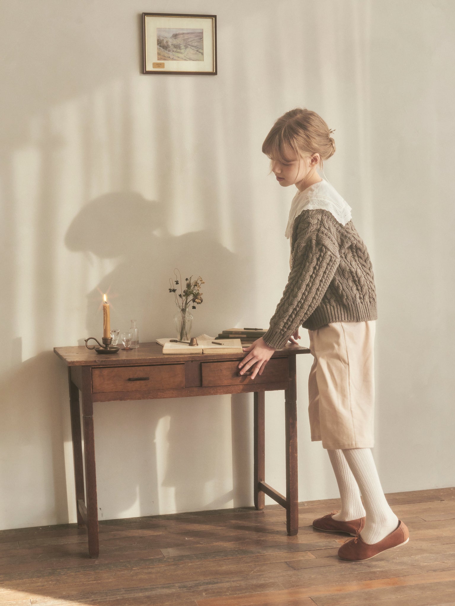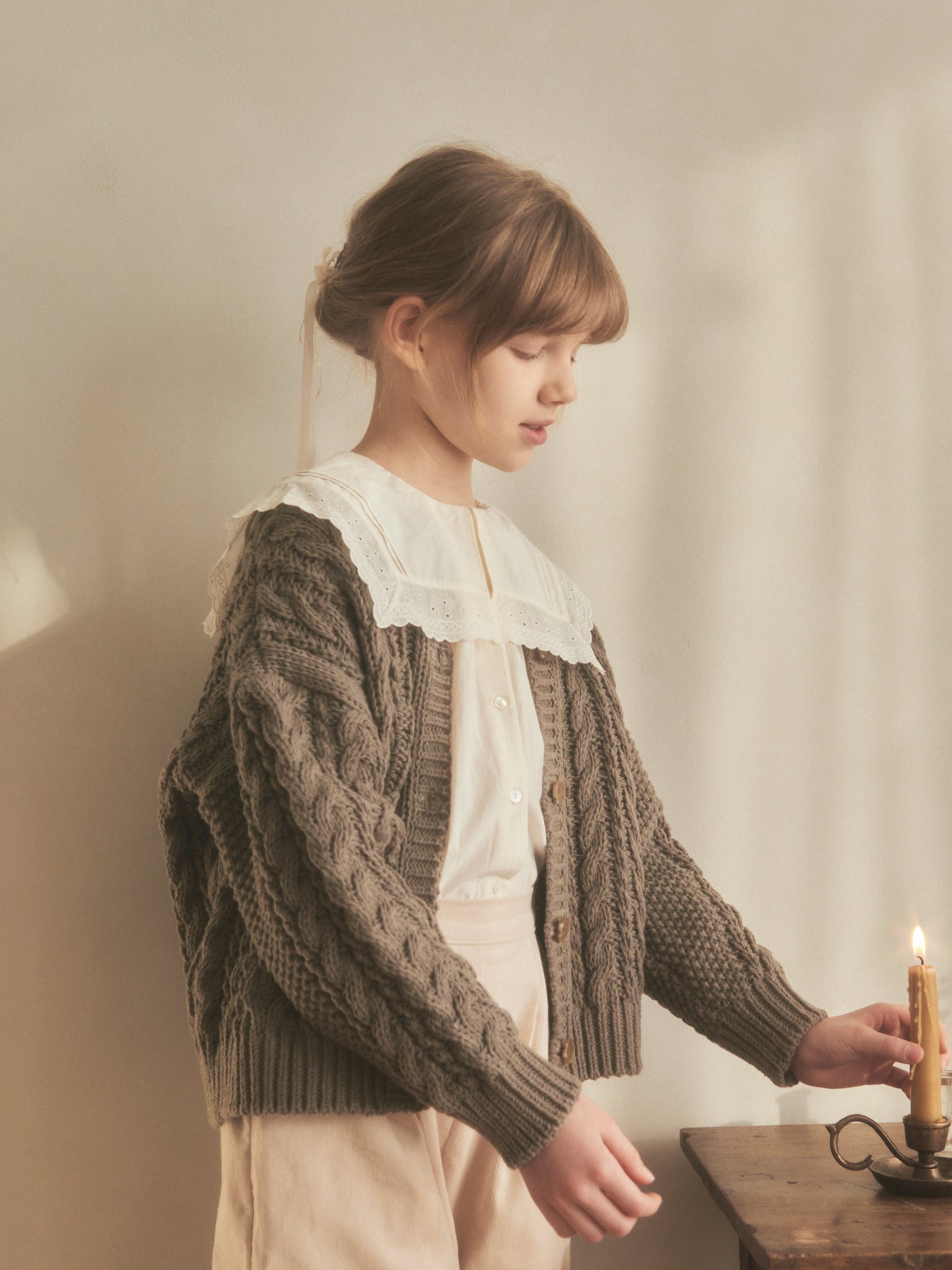 Cableknit cardigan of vintage inspiration in its pattern and color. Perfect for a relaxed and cozy outfit.