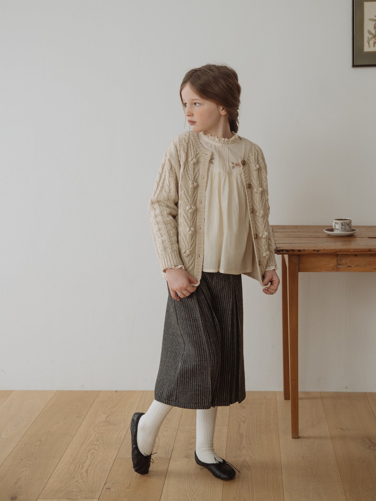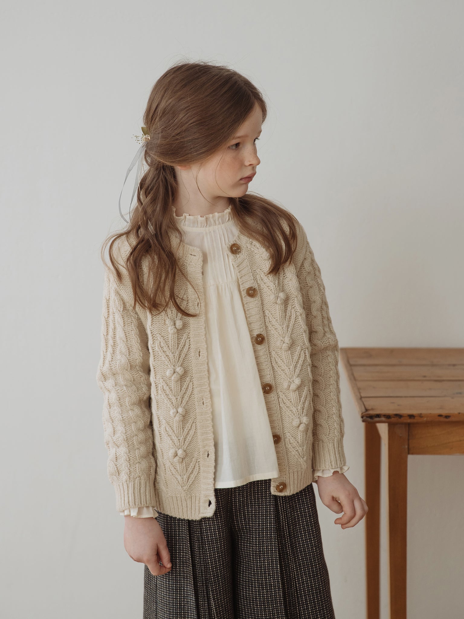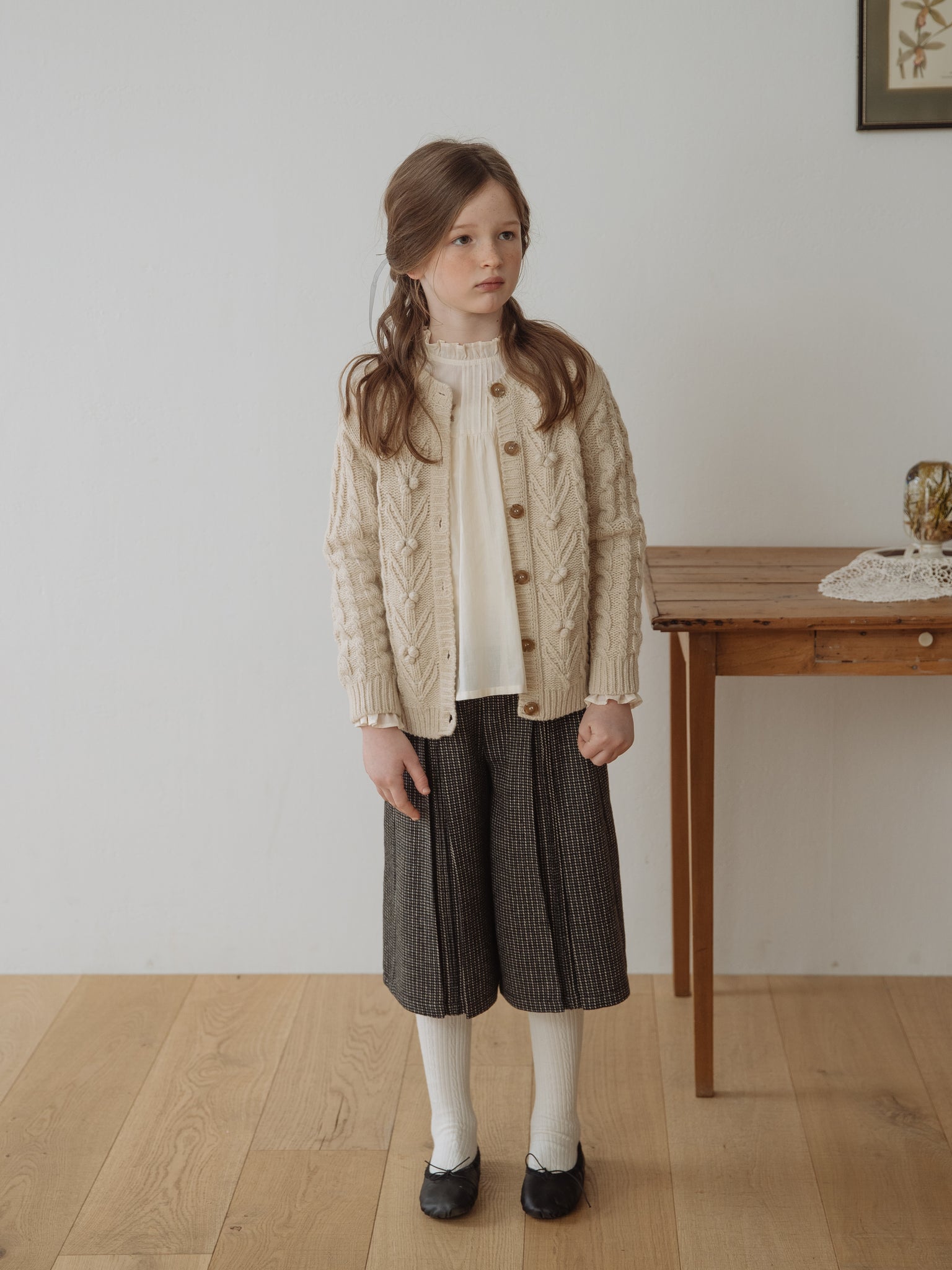 Wide-leg wool pants with pintucks to stay warm and comfortable in winter. To avoid direct contact between the wool and your child's skin, the pants are lined with a soft fabric.