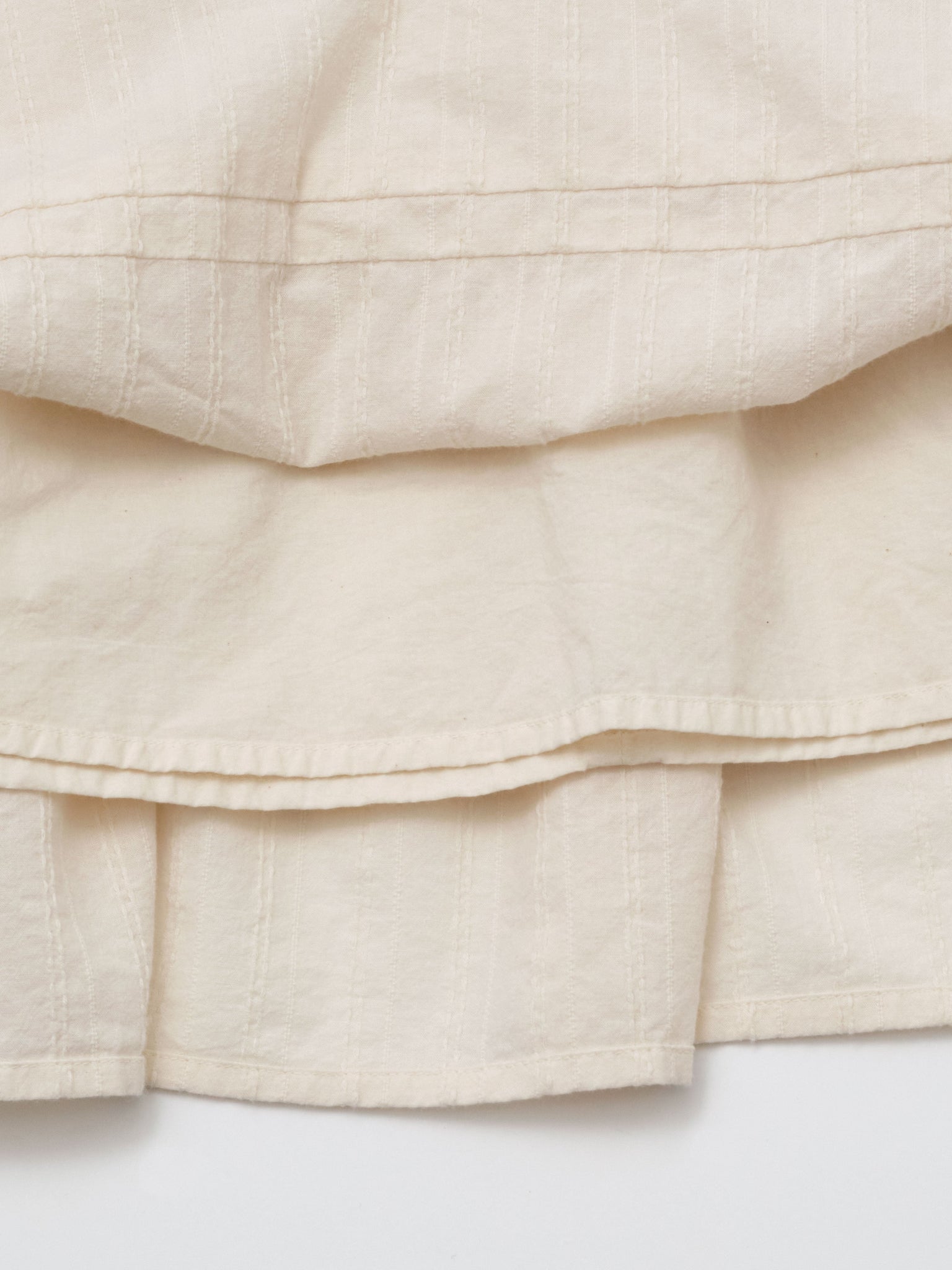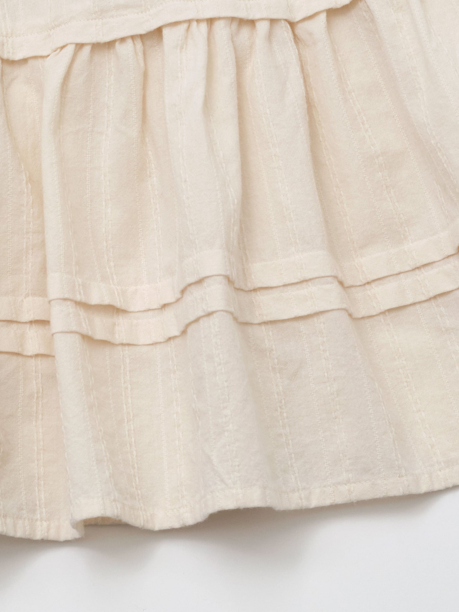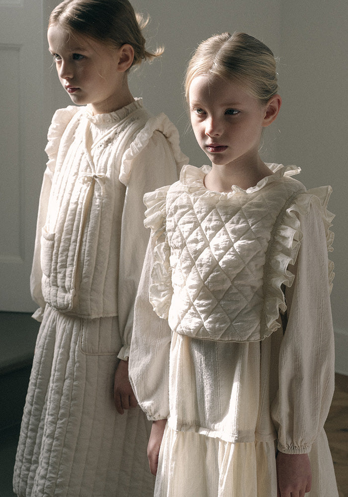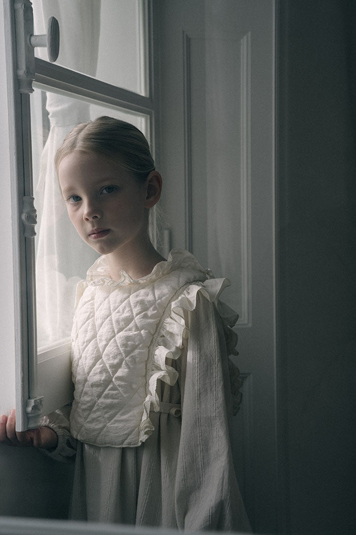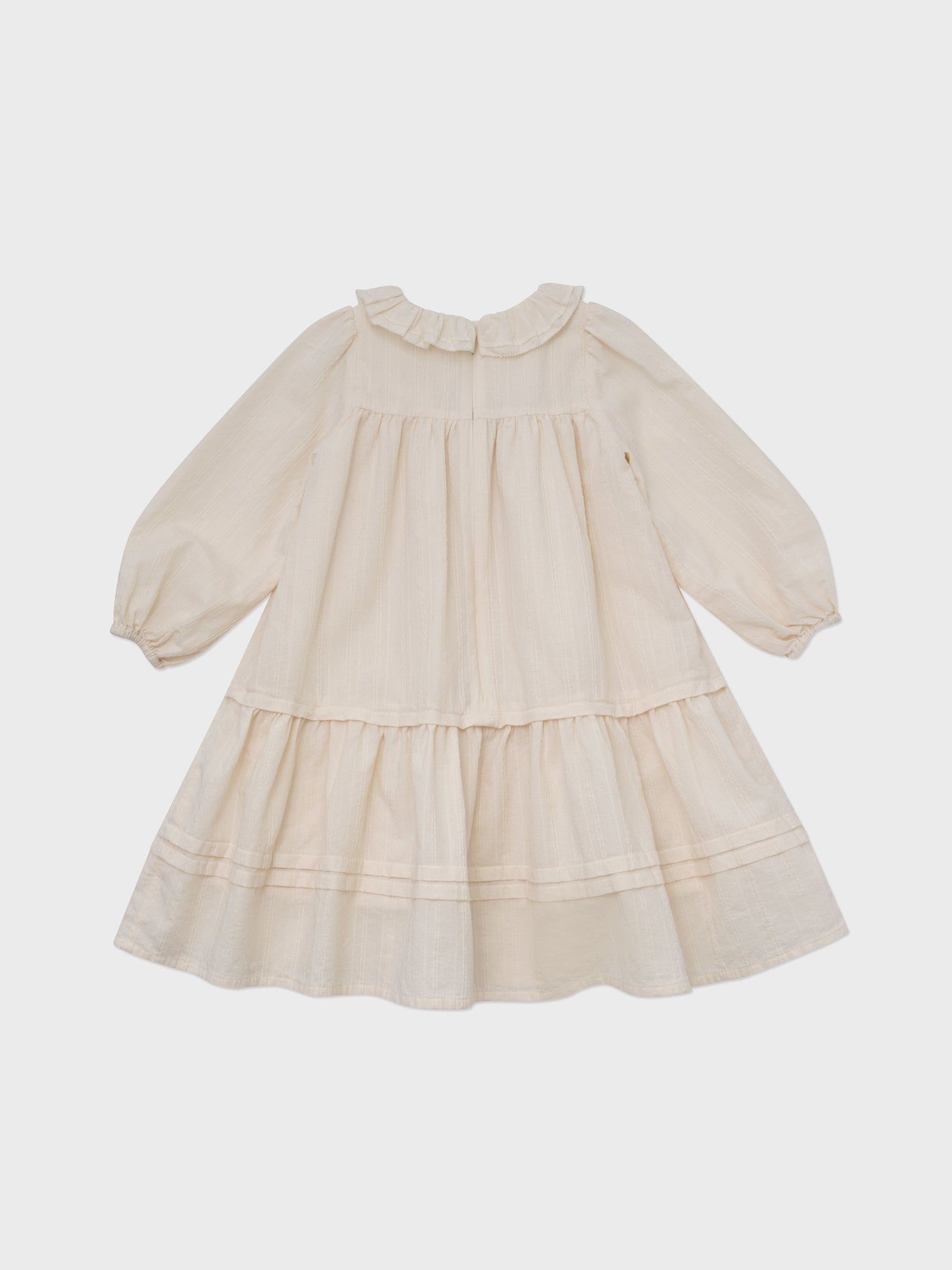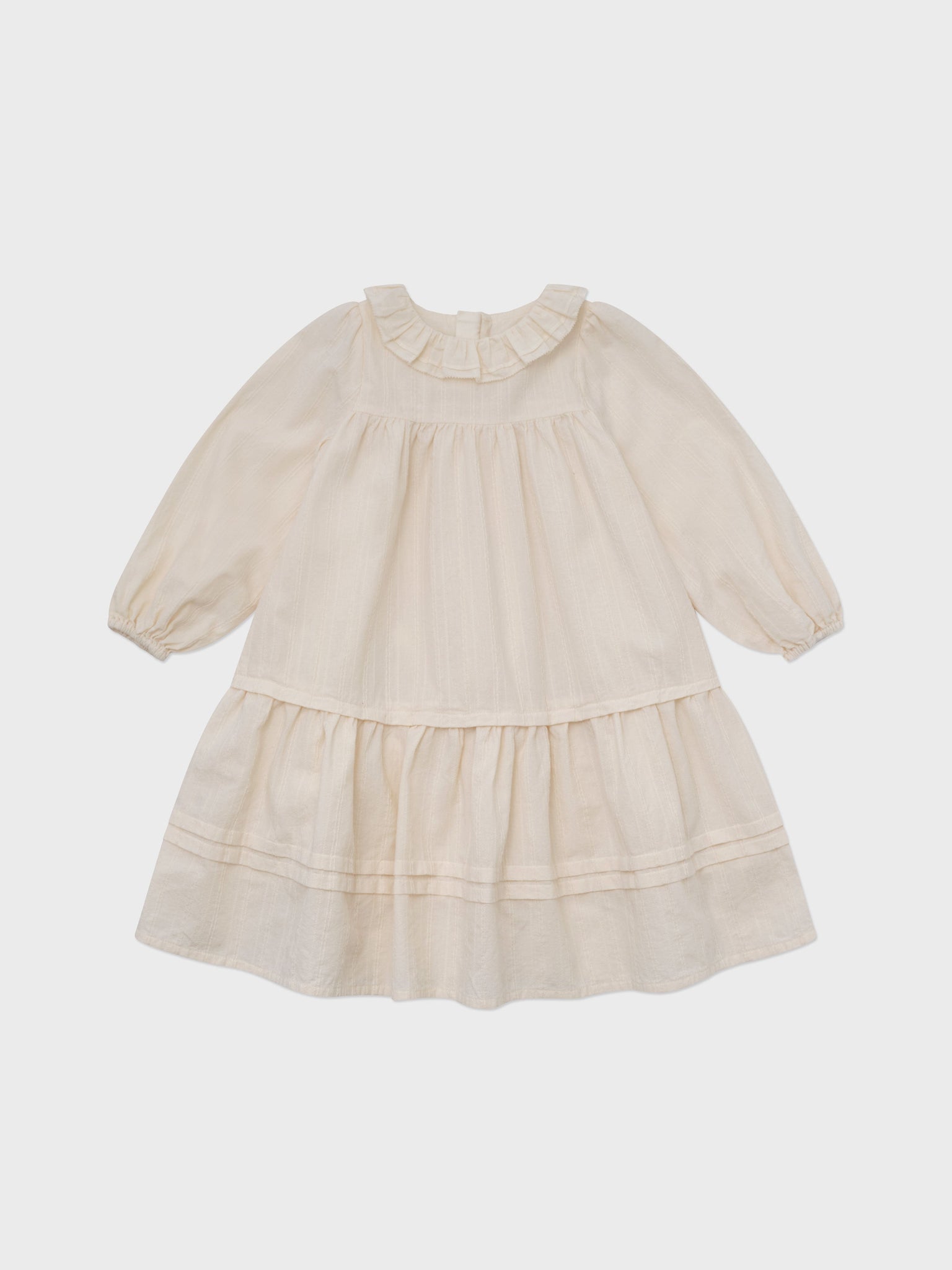 Crafted from delicate fabric, this girl's long-sleeved dress features a soft tone-in-tone subtle woven stripe pattern. The slight texture of the fabric, paired with its multiple tiers, creates a romantic silhouette—an interpretation of the pure winter mood. As a natural cotton-colored dress, it is fully lined to ensure utmost comfort. For a cozier winter look, effortlessly pair it with our quilted vest.