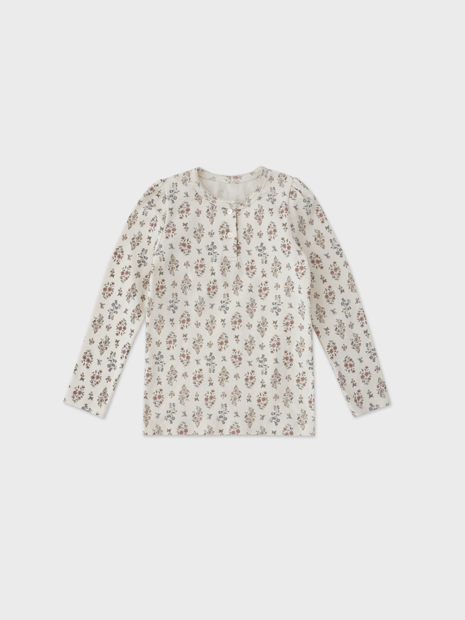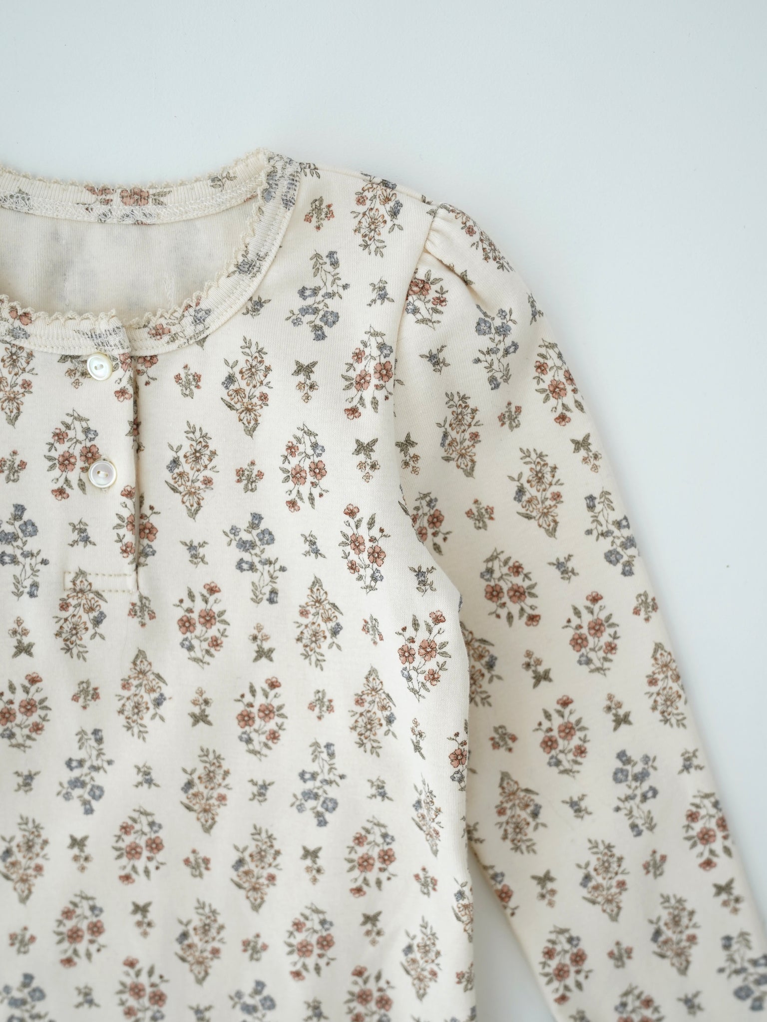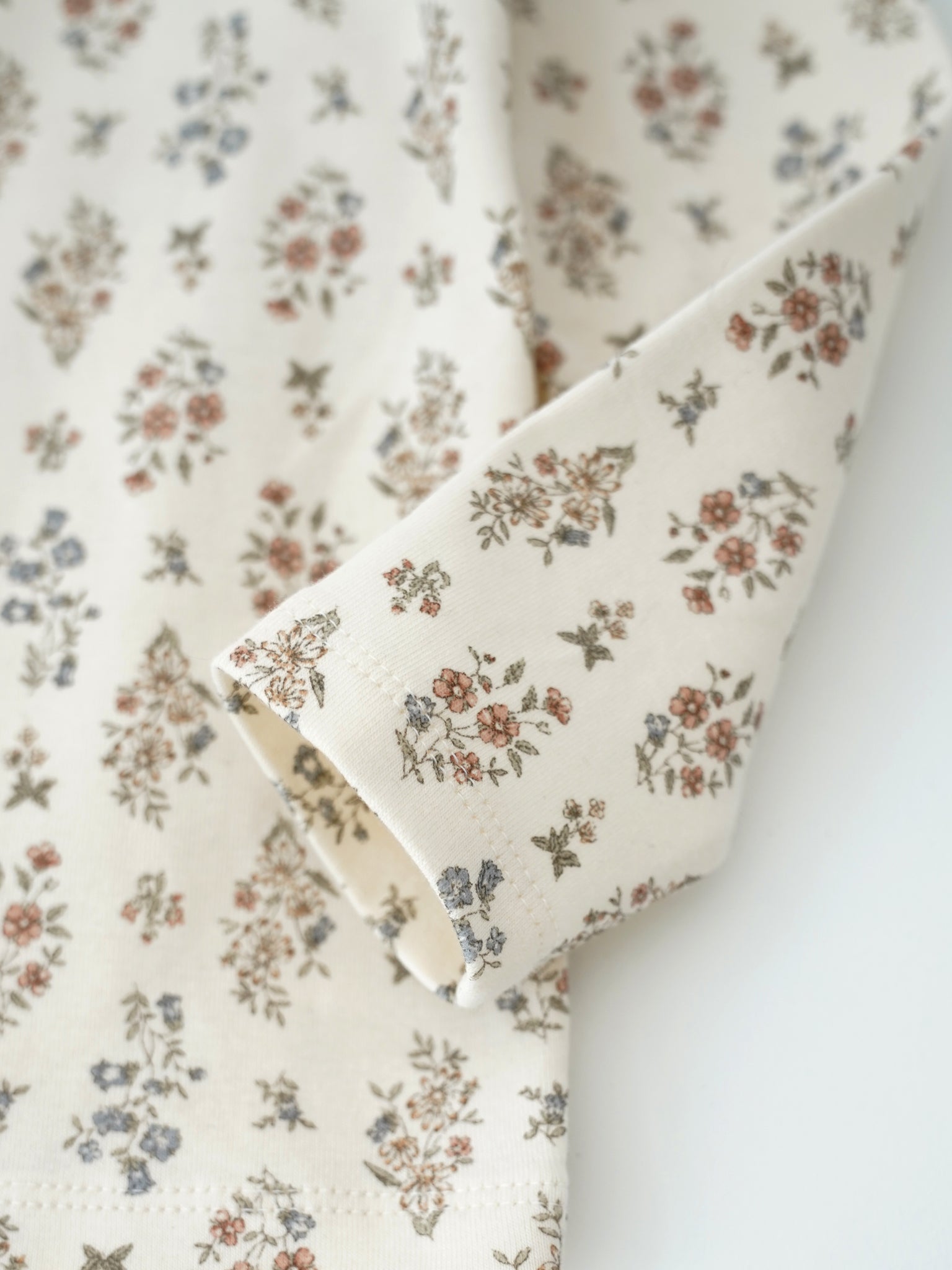 A soft pajama set in a vintage flower print unique to louisiella, made of a long sleeve top and leggings.