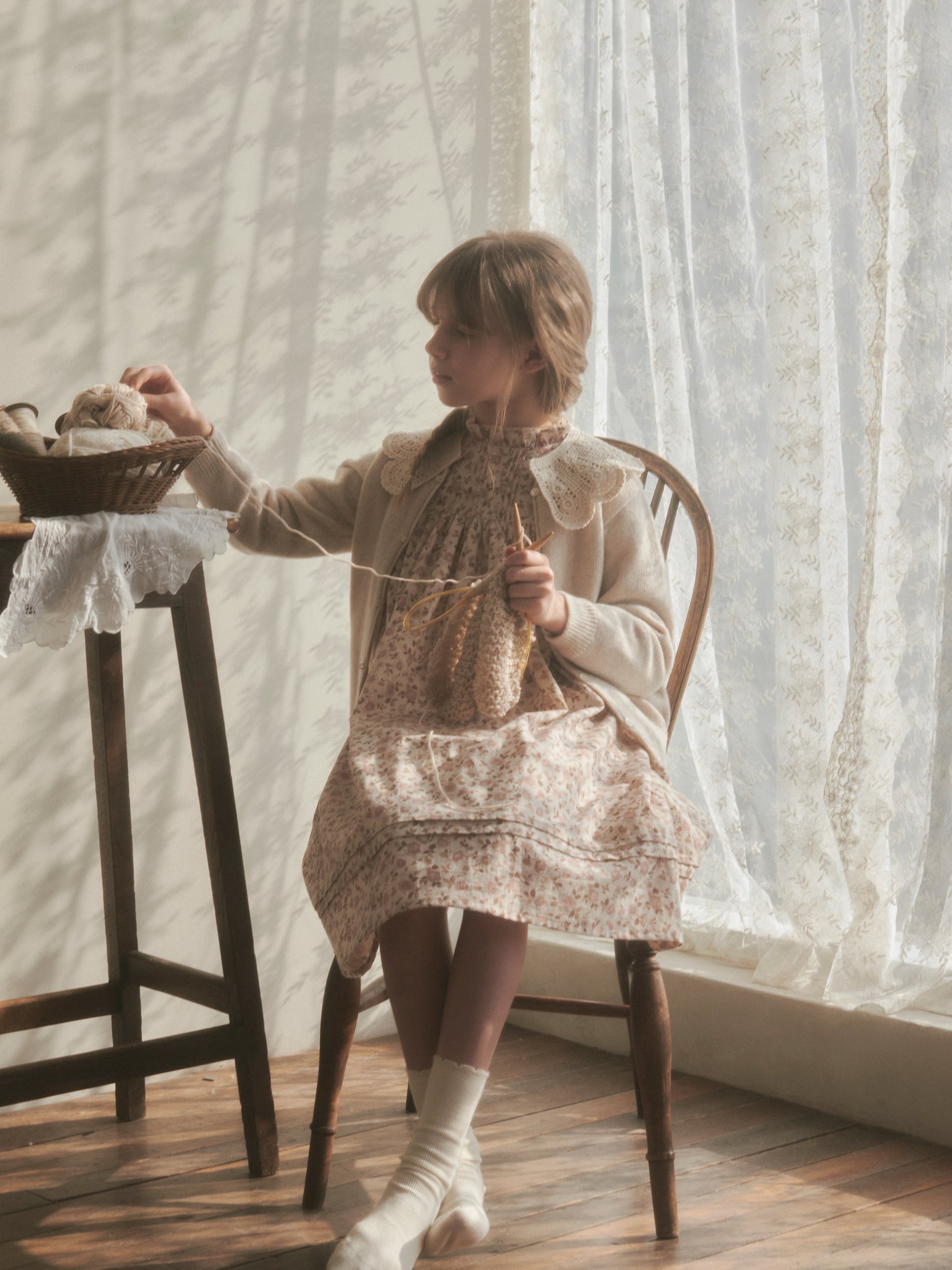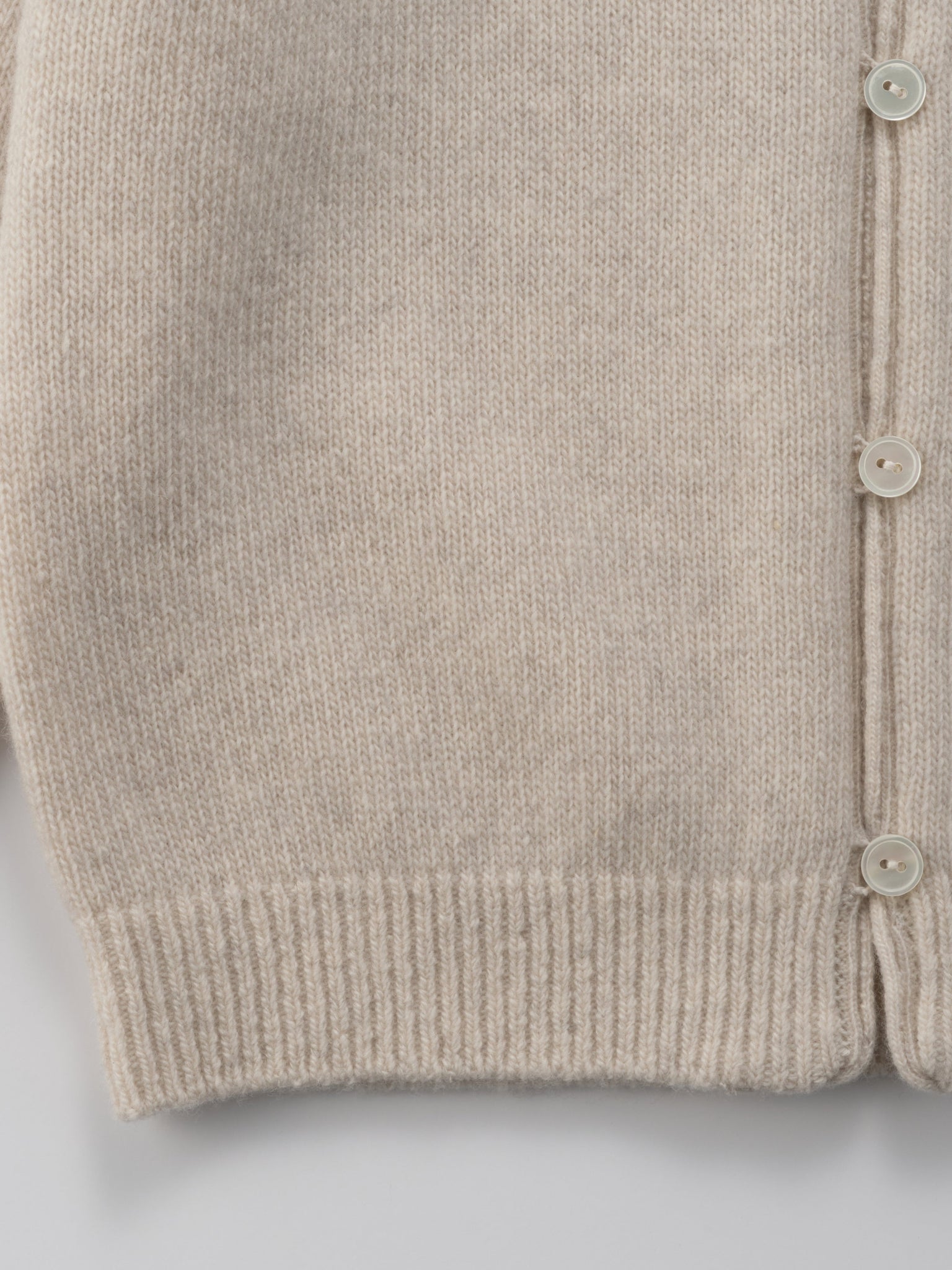 Soft and cozy knit cardigan made in fine wool. Its soft light beige color and delicate button loops adds a touch of refinament and feminity to the design.