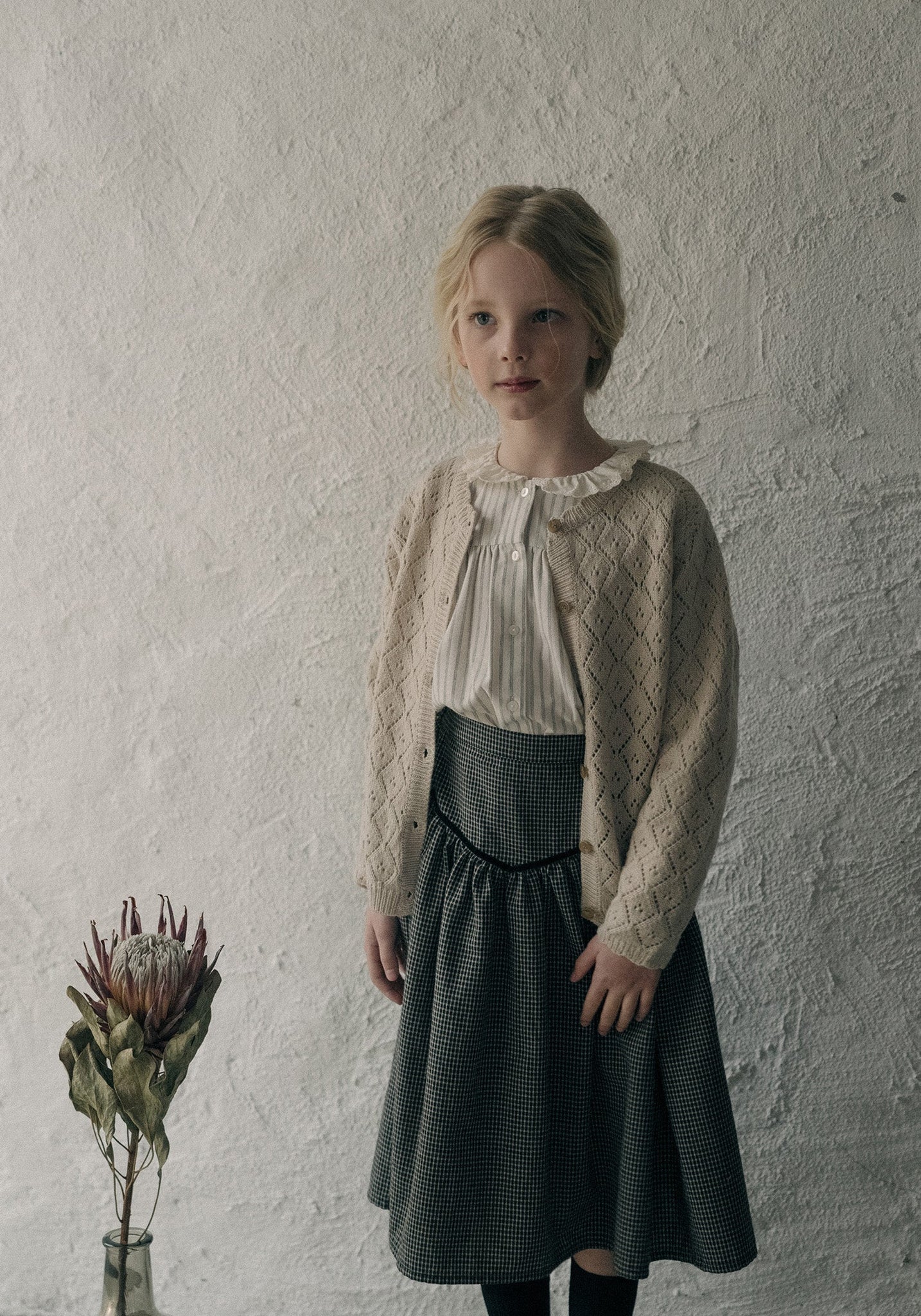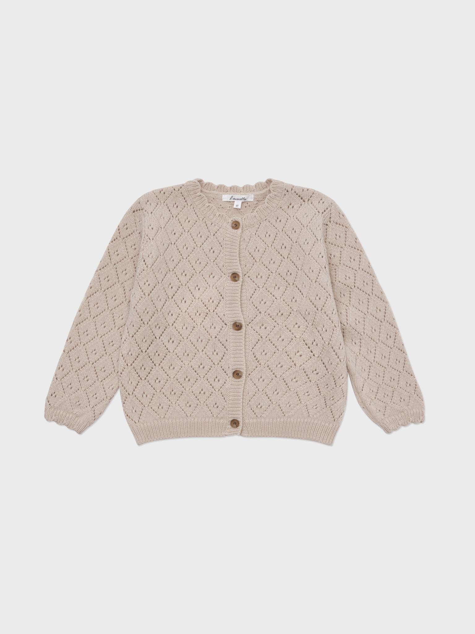 In line with Louisiella's vintage aesthetic, this girl's cardigan is crafted in a delightful diamond knit pattern. Lightly openworked and featuring a cute scallop hem, it exudes refined sophistication, making it a timeless addition to your young lady's wardrobe. A classic piece that will elevate your girl's outfit with a vintage touch.