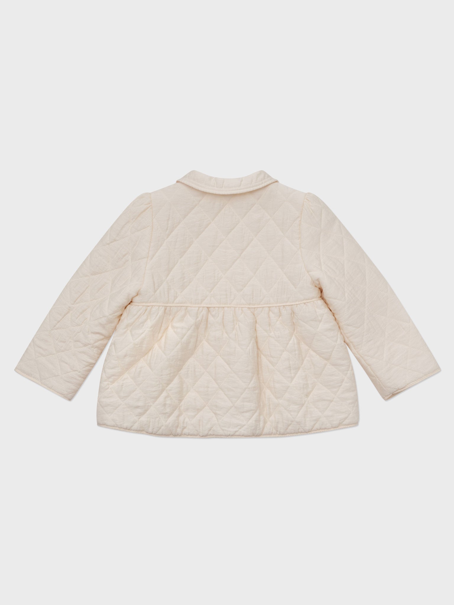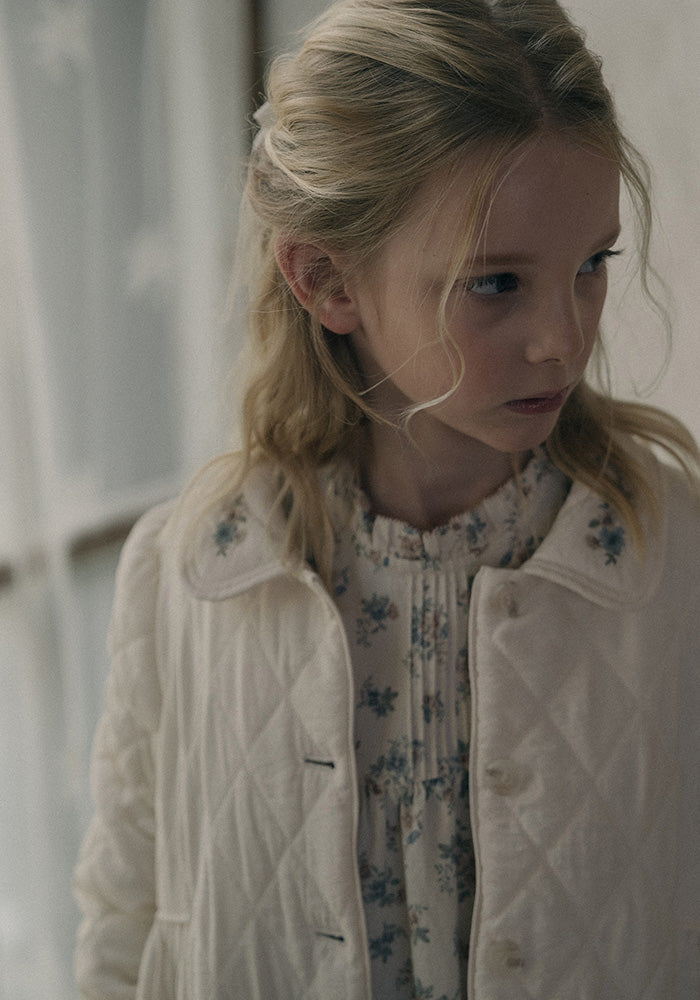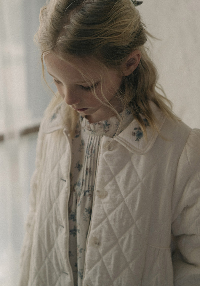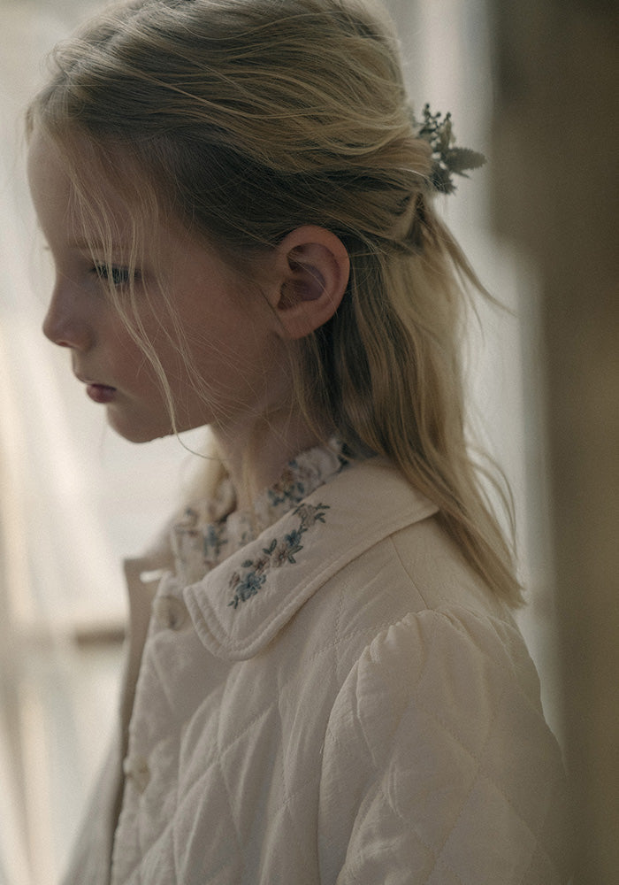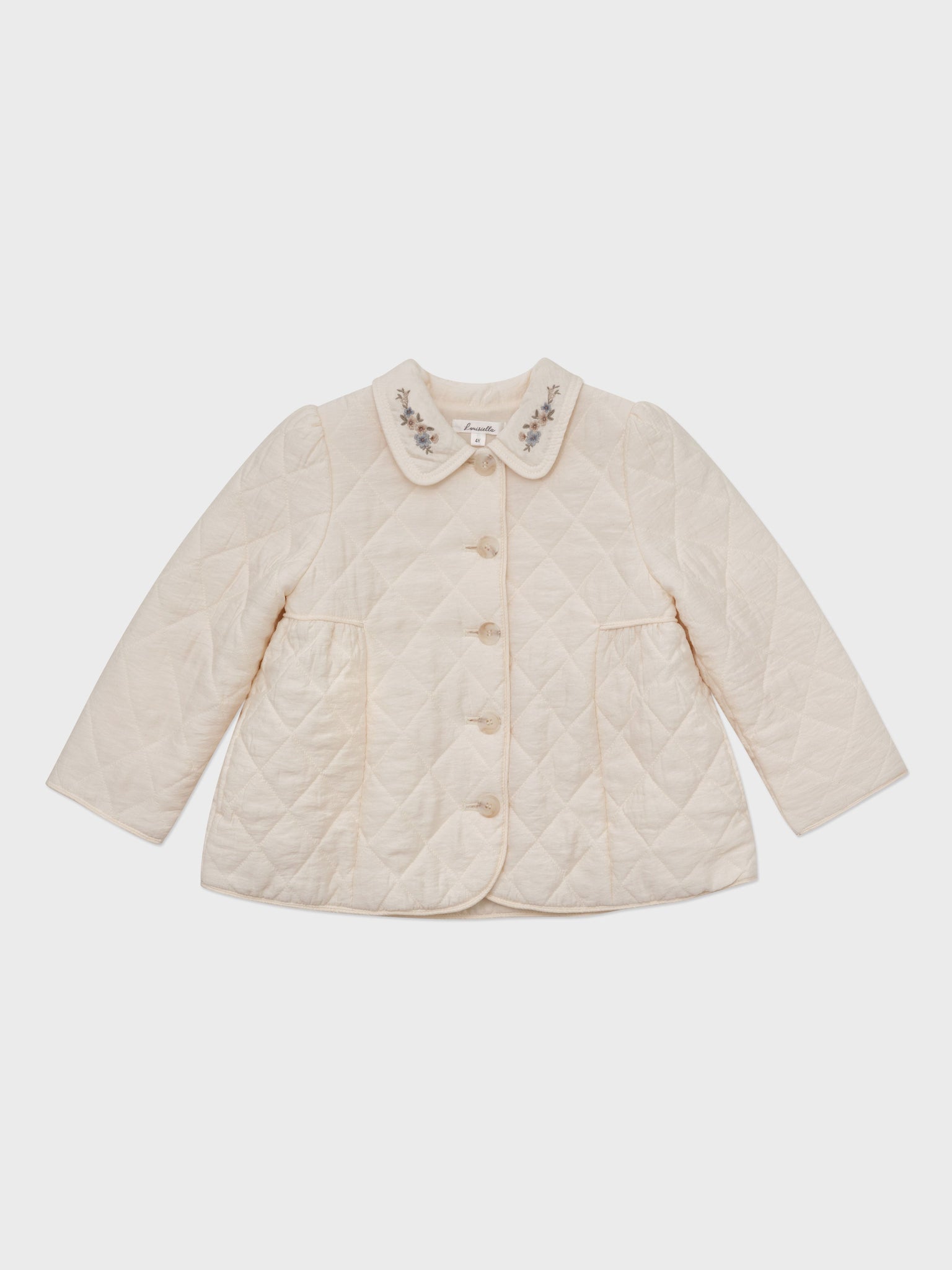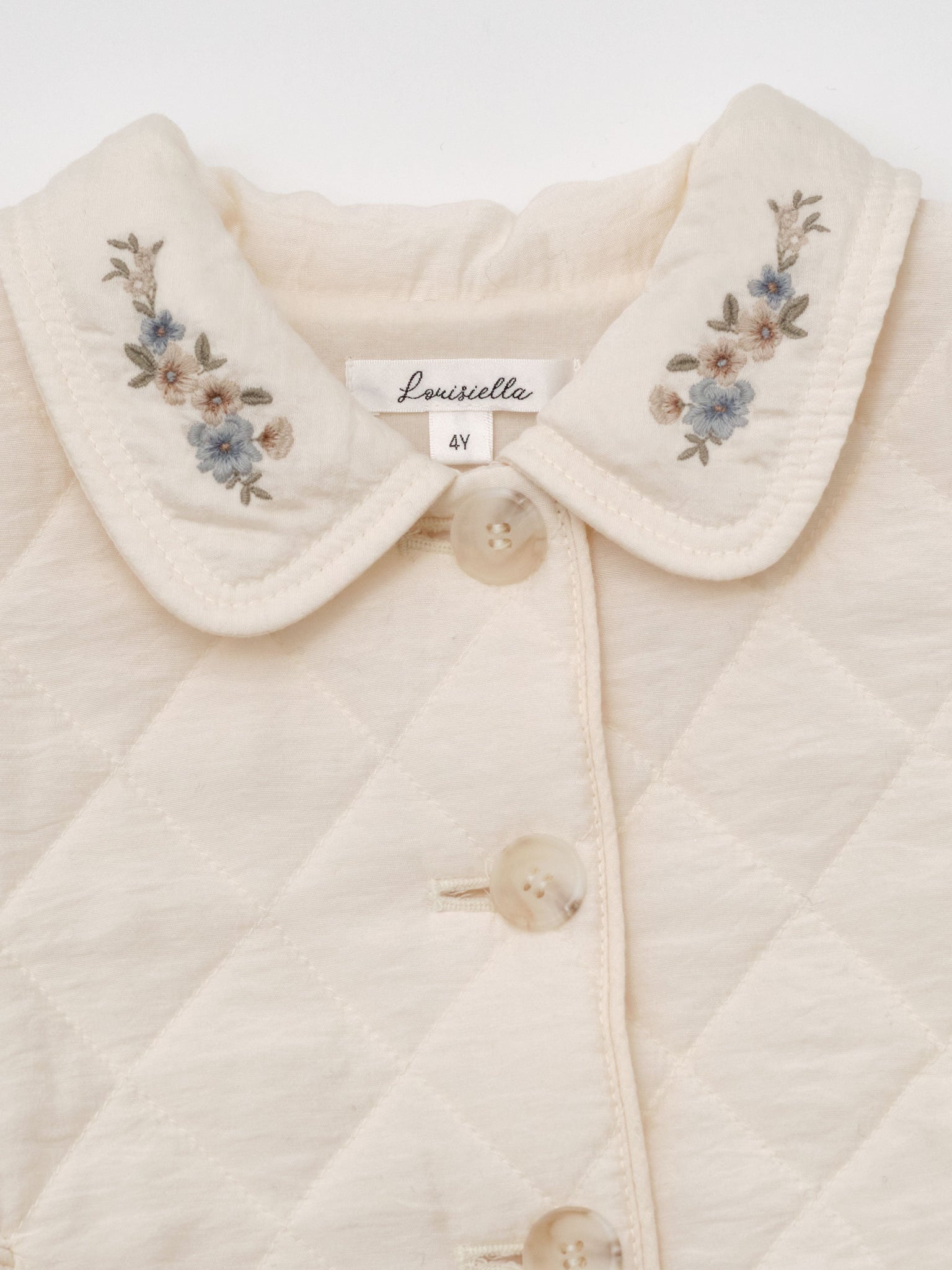 Introducing the newest iteration of Louisiella's iconic quilted jacket — the delicately embroidered girl's Verre Jacket. With its vintage diamond quilting pattern and floral embroidery, this winter jacket exudes undeniable timeless properties, synonymous with Louisiella. Its warm cream color complements winter sceneries and effortlessly fits into your girl's wardrobe.