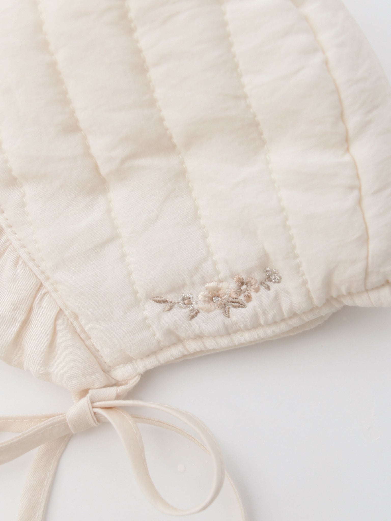Complete the perfect baby girl outfit with Louisiella's baby bonnet, designed to match our Diamant line. The light padding and frilled hem will gracefully crown your little one while ensuring warmth. We recommend pairing it with the matching romper or bodysuit, along with our baby blanket, for the perfect layette gift set.