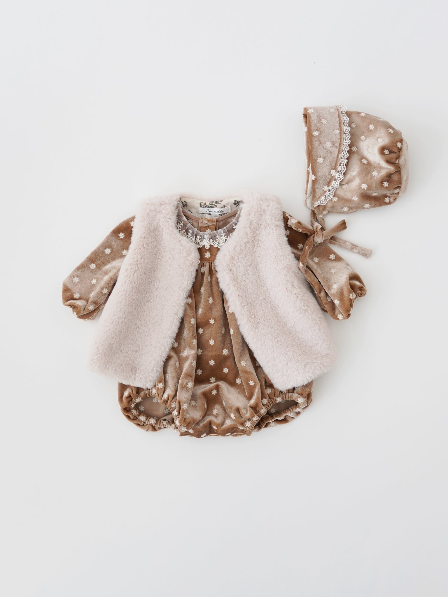 Luxueuse combinaison en velours brodé, qui de par sa brillance subtile et ses fronces, rehausse la tenue de votre petite fille pour toute occasion spéciale.