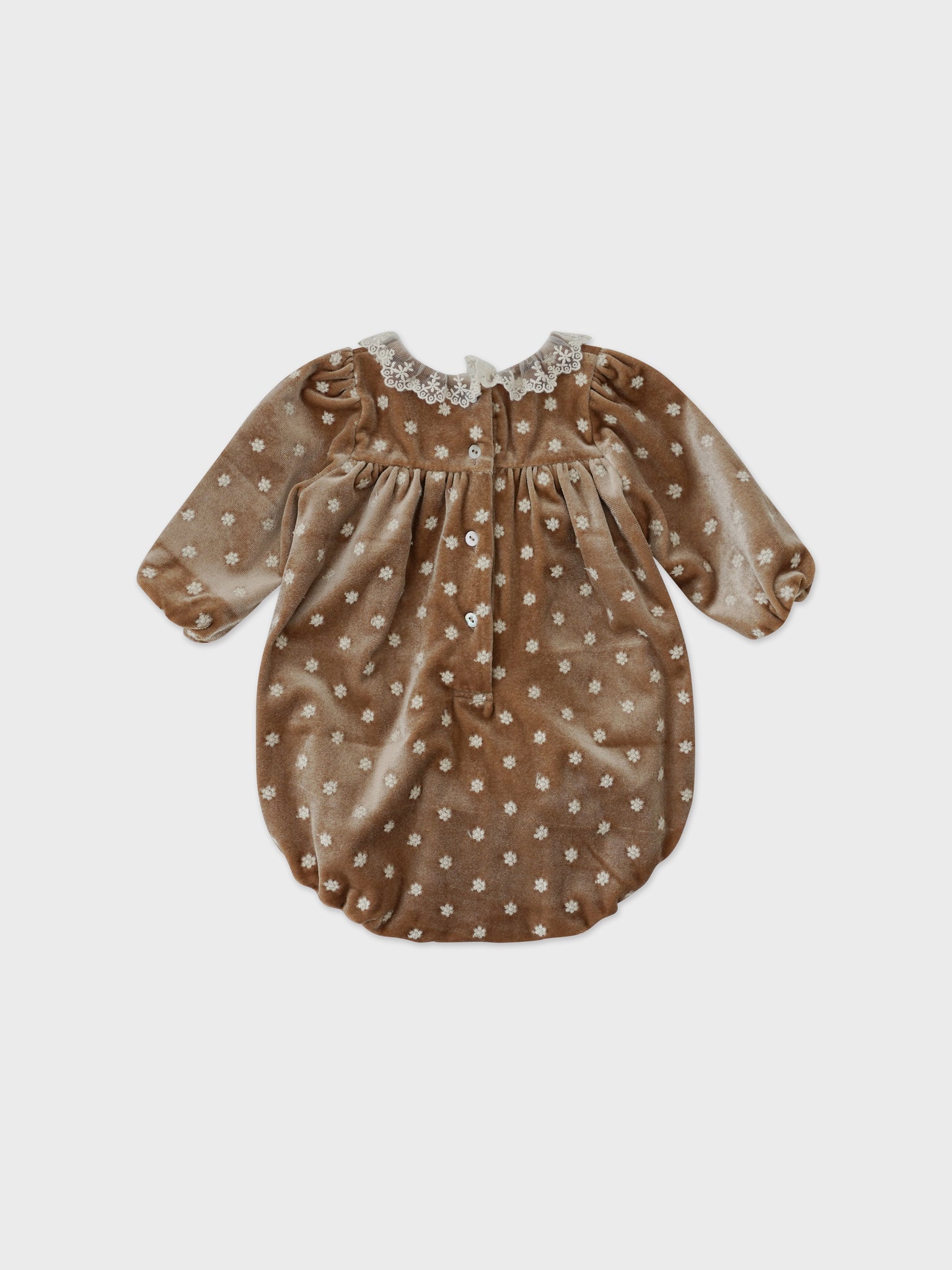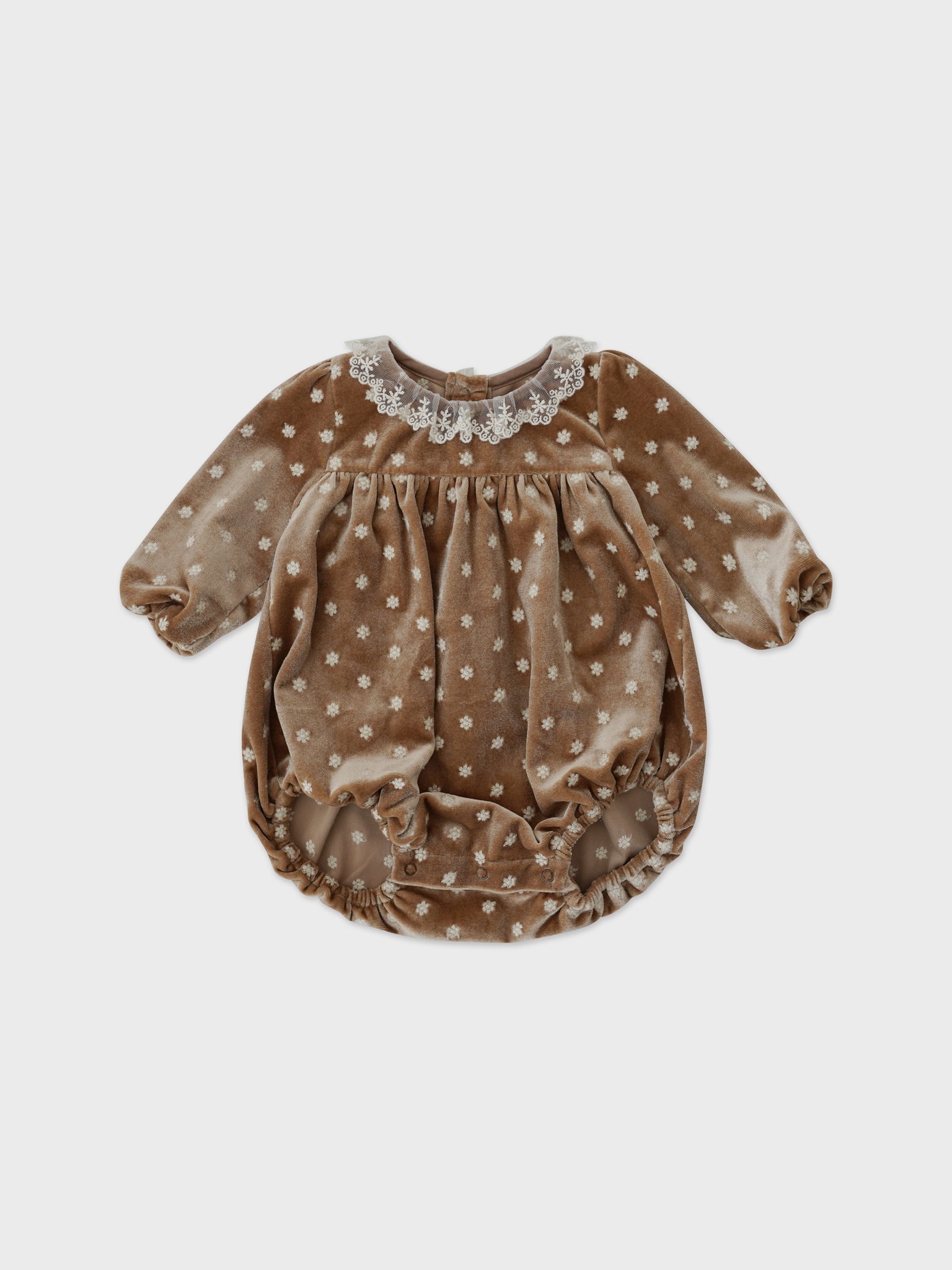 Luxurious embroidered velvet romper, which with its subtle shine and gathering, elevate your little girl outfit for a special occasion.