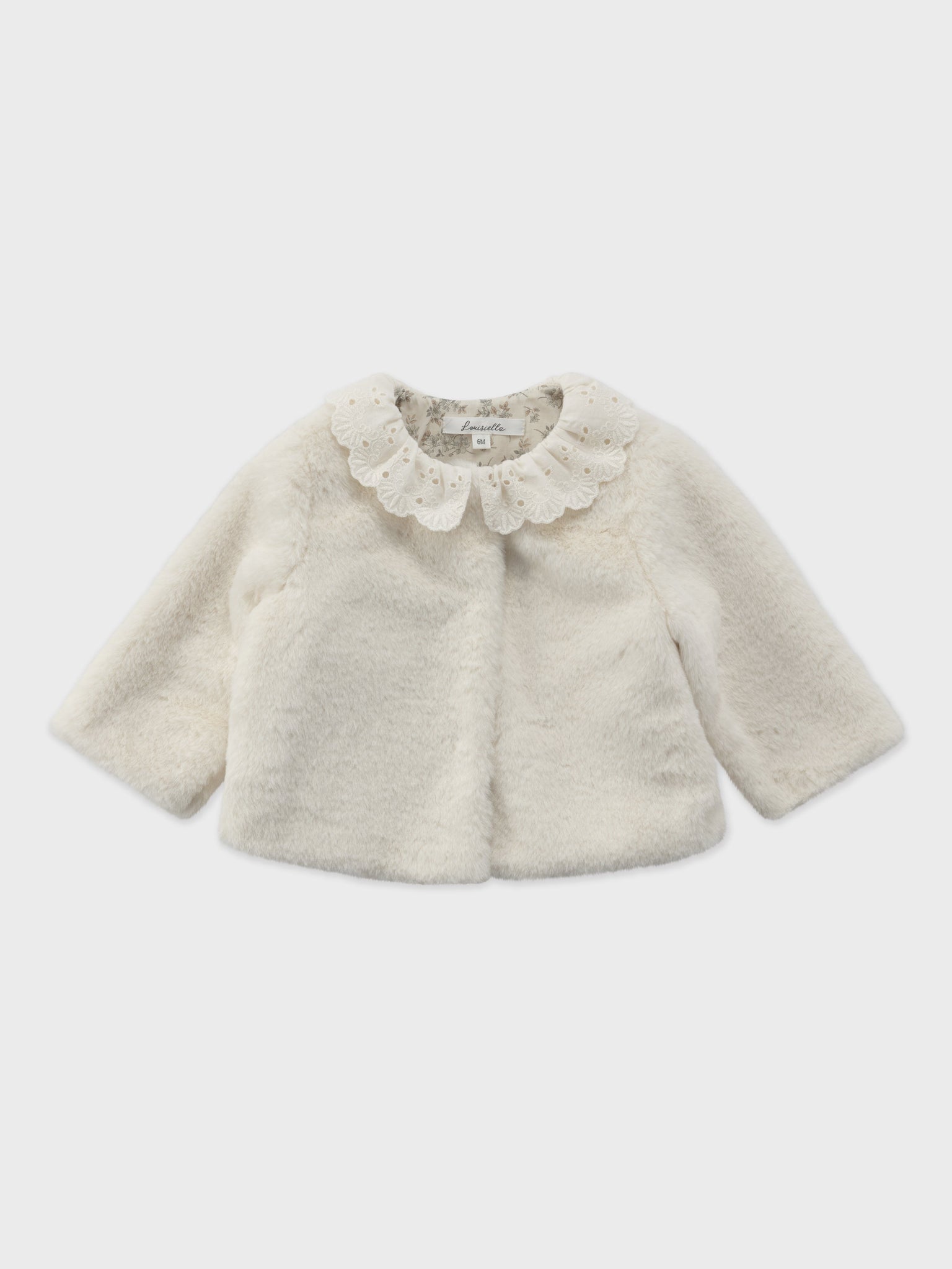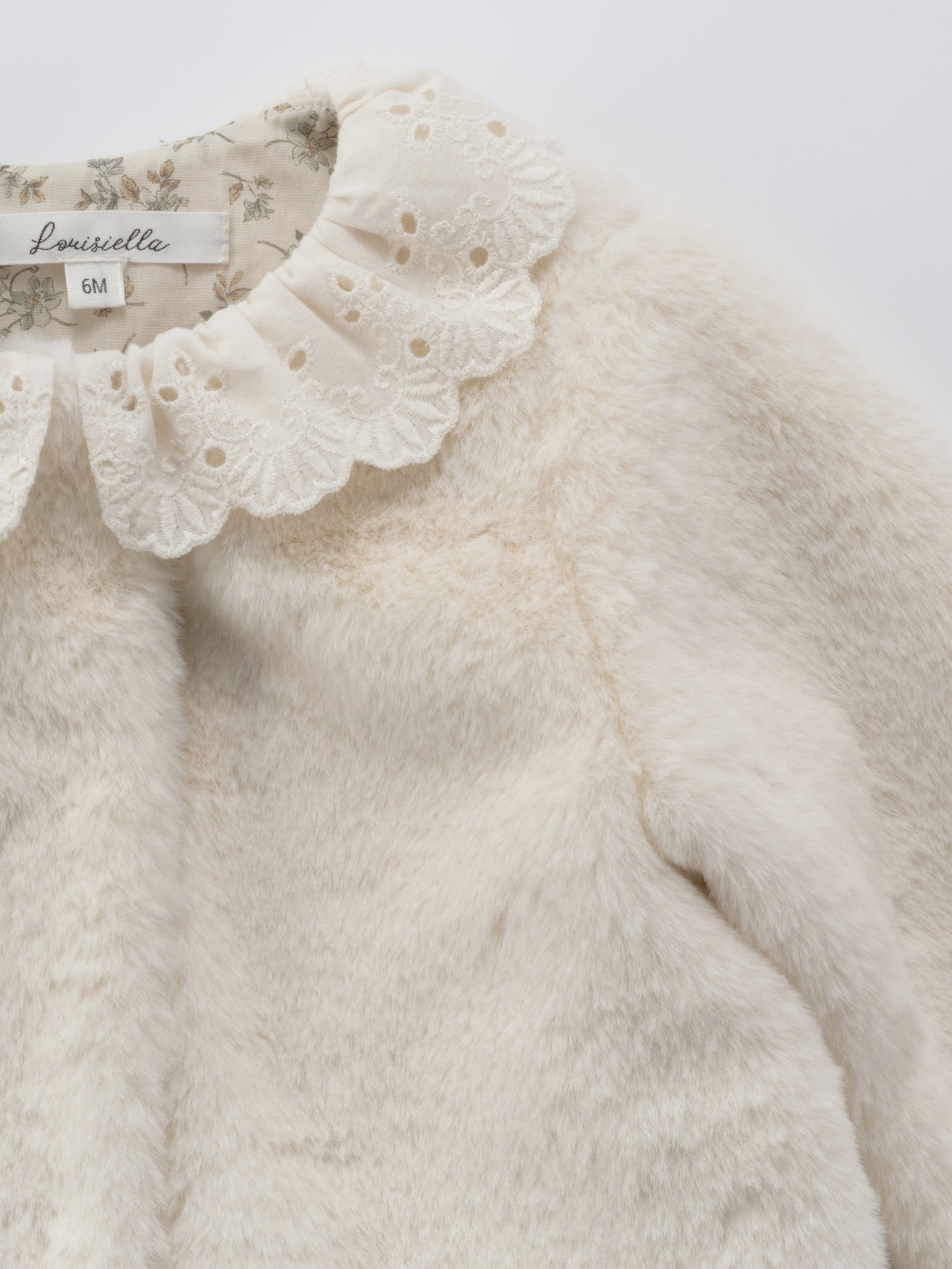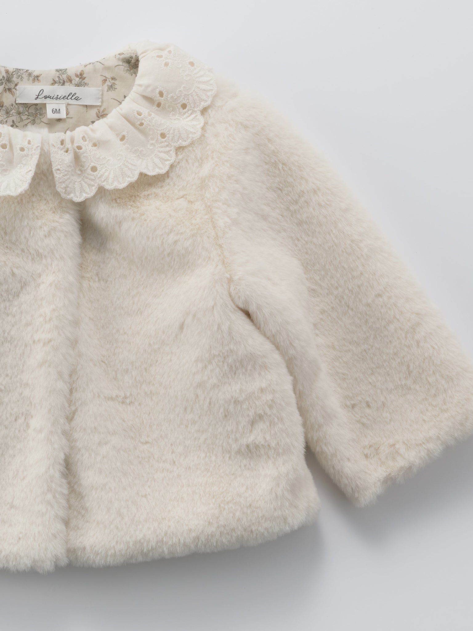 Lovely faux-fur baby coat with a romantique lace collar.Light but warm, with its soft and cuddly fabric, it's perfect for winter days.