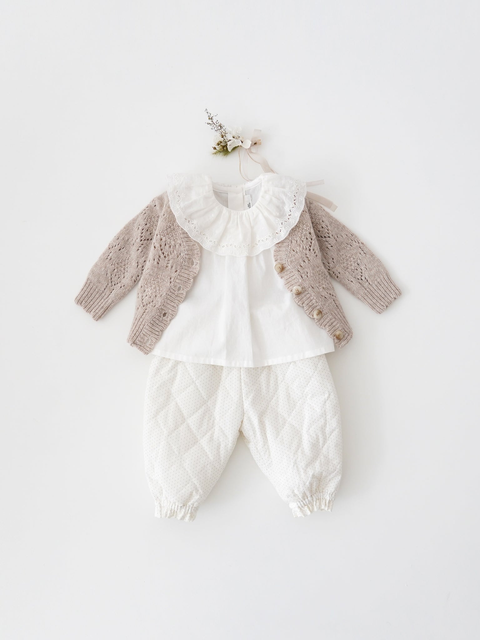Made in a diamond quilted fabric, these baby pants are warm and cute thanks to its polkadot print.