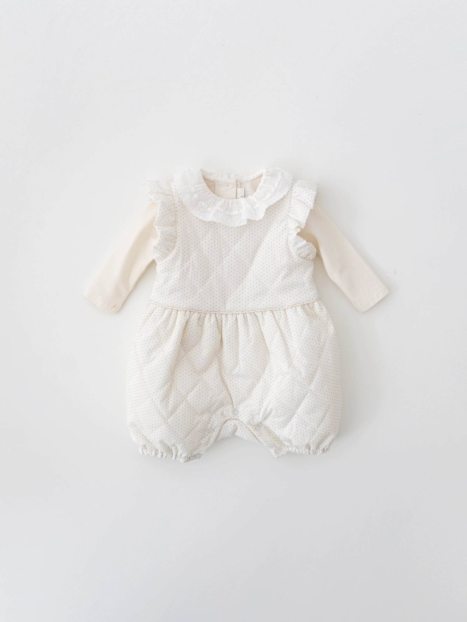 Made in a diamond quilted fabric, with ruffled shoulders, this romper is warm and cute thanks to its polkadot print.