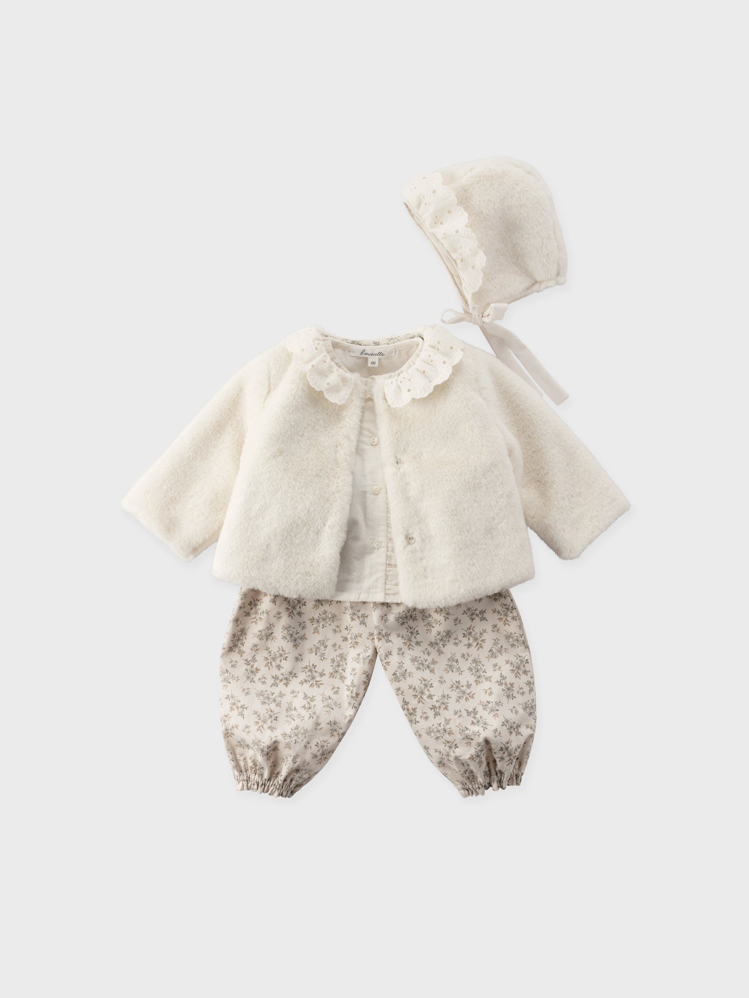Pantalon bébé imprimé de fleurs présentant la sensibilité propre à Louisiella. Ses volants à la taille et au bas des jambes ajoutent à son charme.