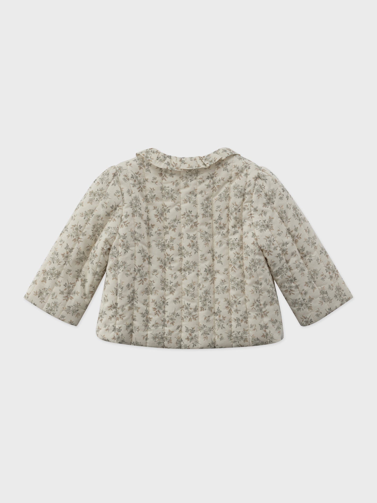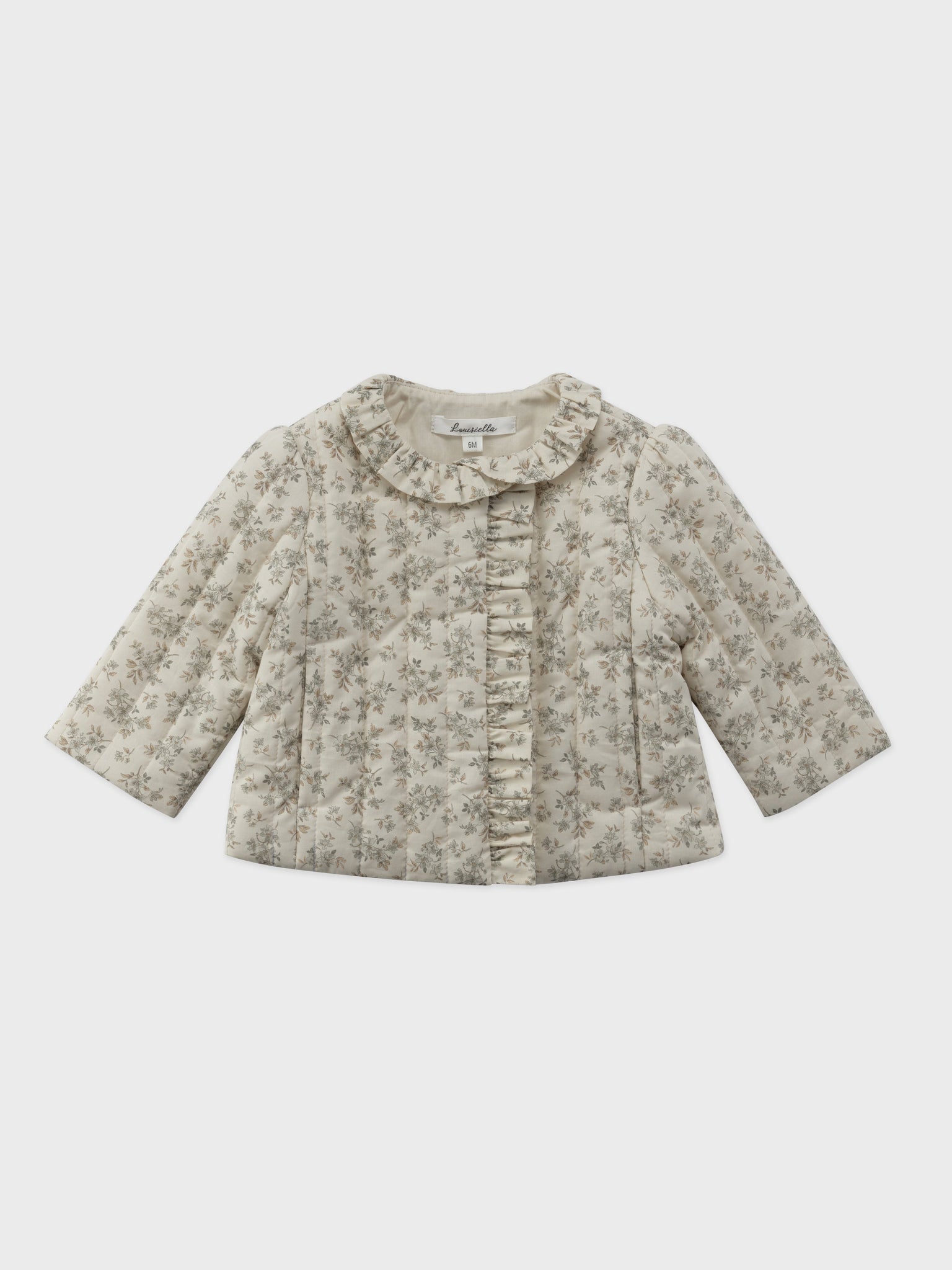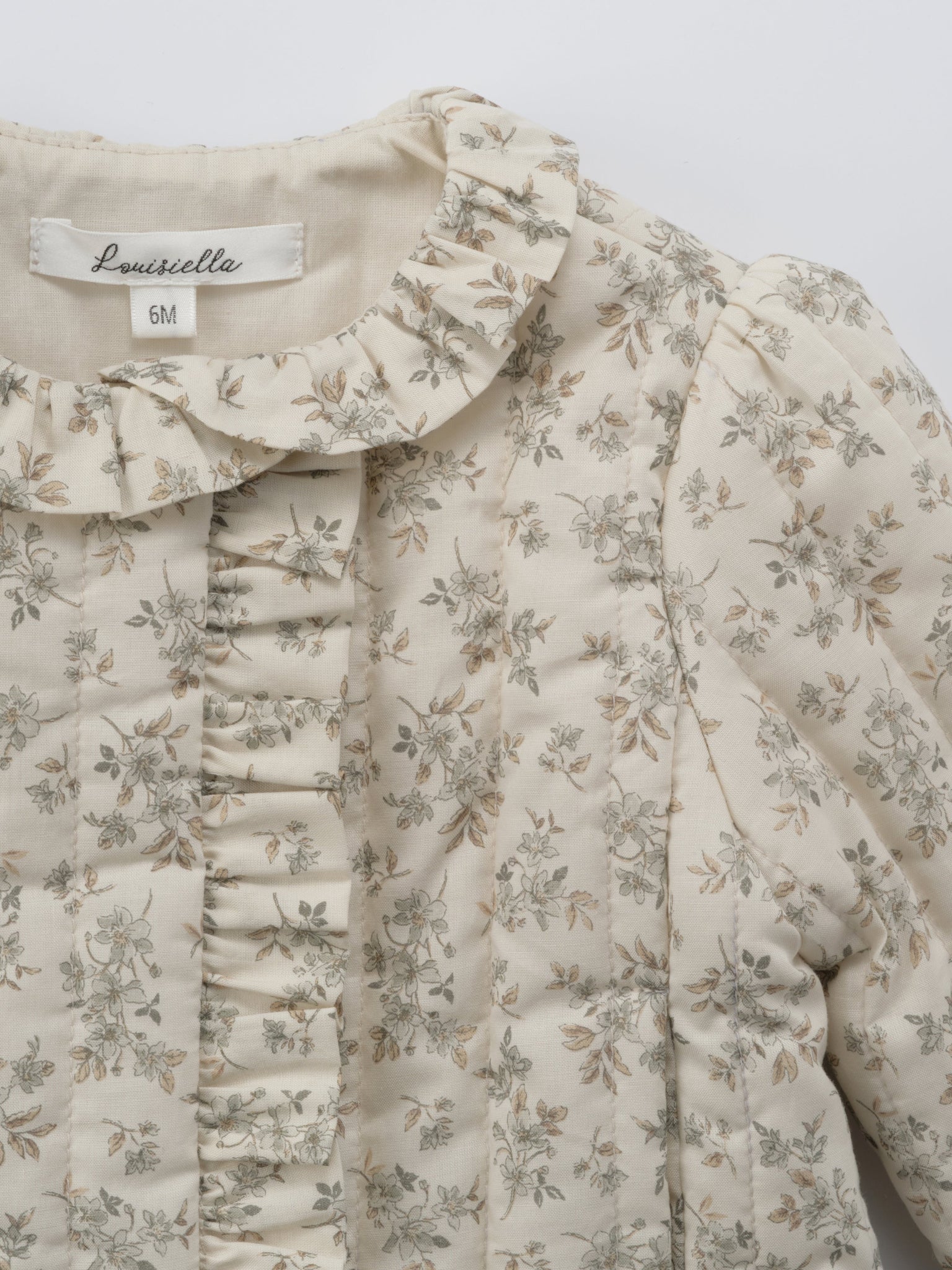 Flower print quilted baby jacket with Louisiella's signature sensibility. The ruffles flowing along the collar and front oppening adds a feminine touch to its look. Light with its 2 ounces padding but warm, it's perfect for winter days.
