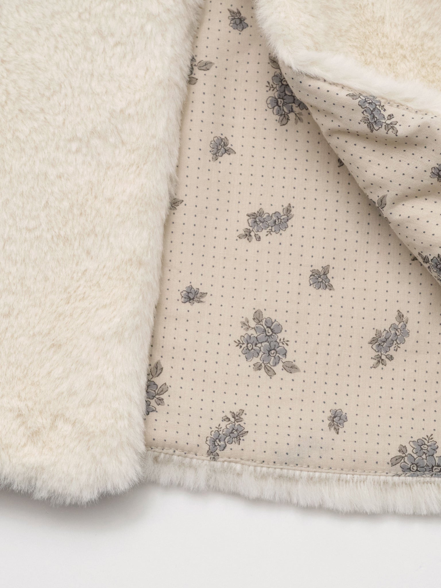 Introducing Louisiella's classic baby's fur vest, now elevated with a printed lining. The softness of the faux-fur delicately envelops your little one while its light cream color will complements winter sceneries and your baby girl's outfit.