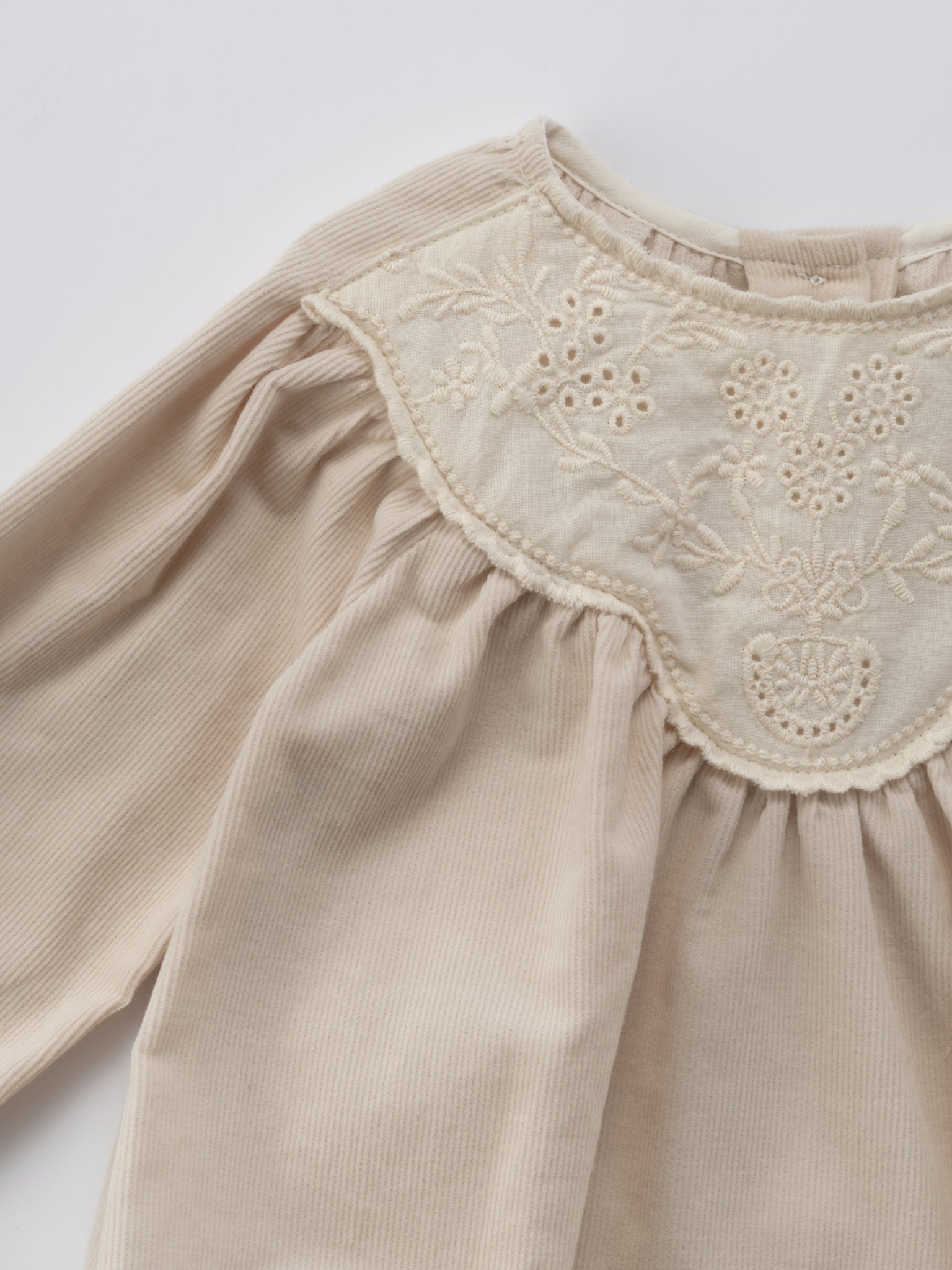 Cozy corduroy baby romper in a warm color with a delicate lace and embroidered collar. Its rich gathering creates a cute and fluffy silhouette.
