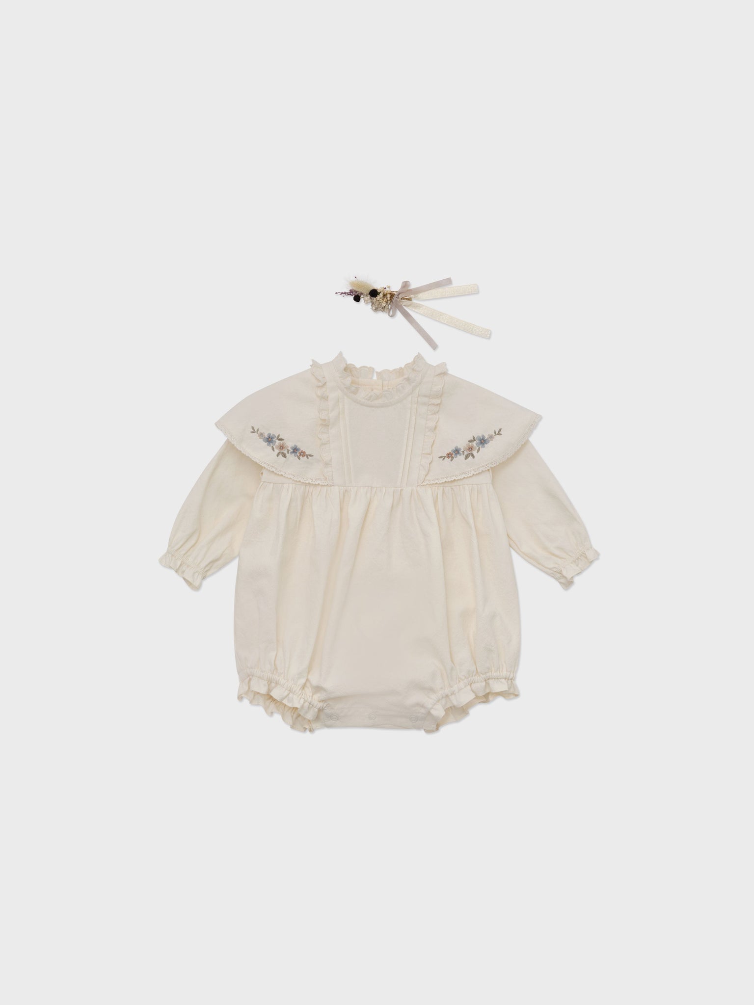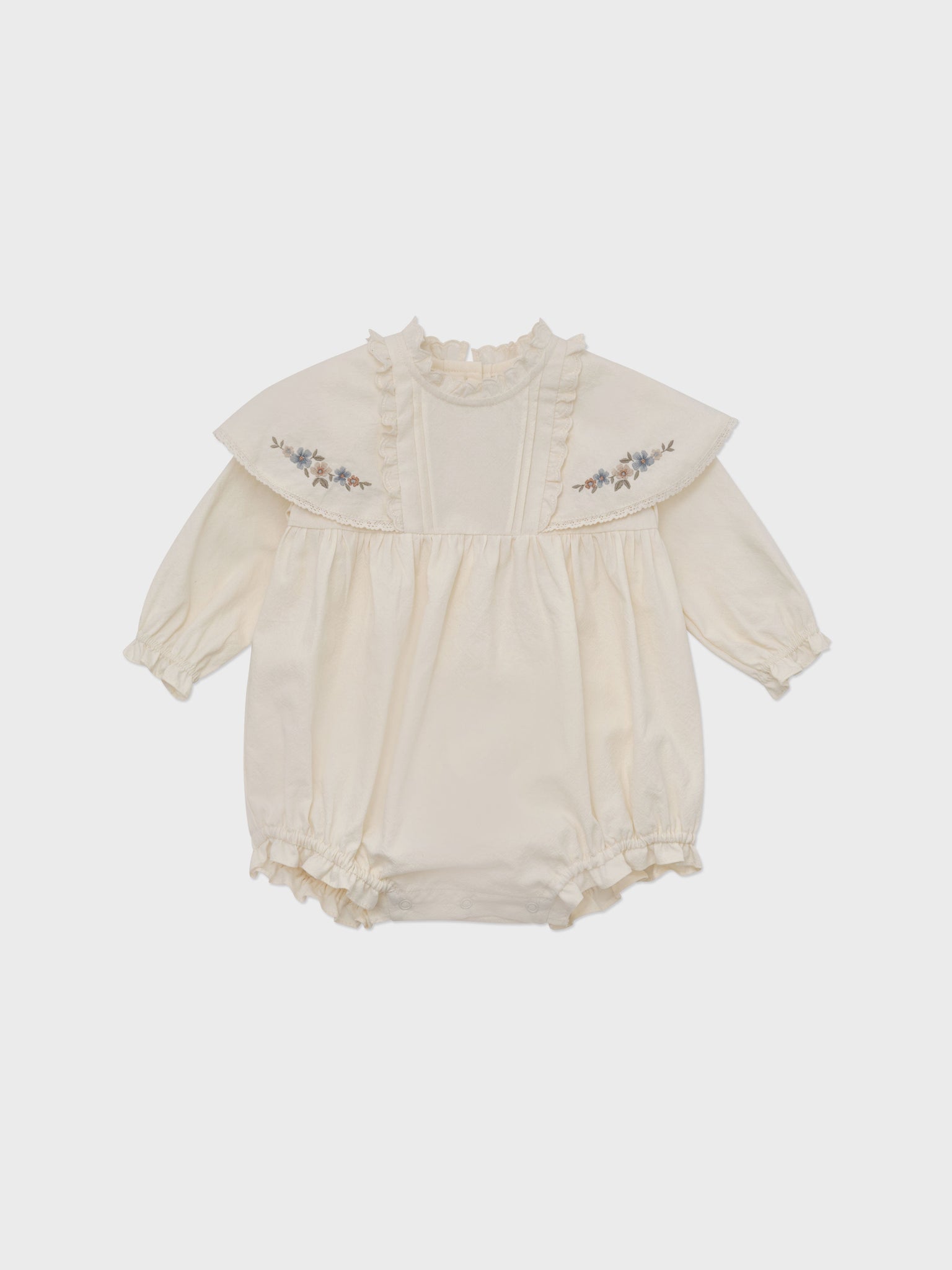 Drawing inspiration from religious clothing and their emblematic shoulder cape, our Iris romper exudes a unique aura. Embellished with dainty floral embroidery and lace ornaments, it adds a touch of youthfulness to the silhouette. Perfect for end-of-year celebrations, we recommend pairing it with warm tights for a cozy and stylish ensemble.