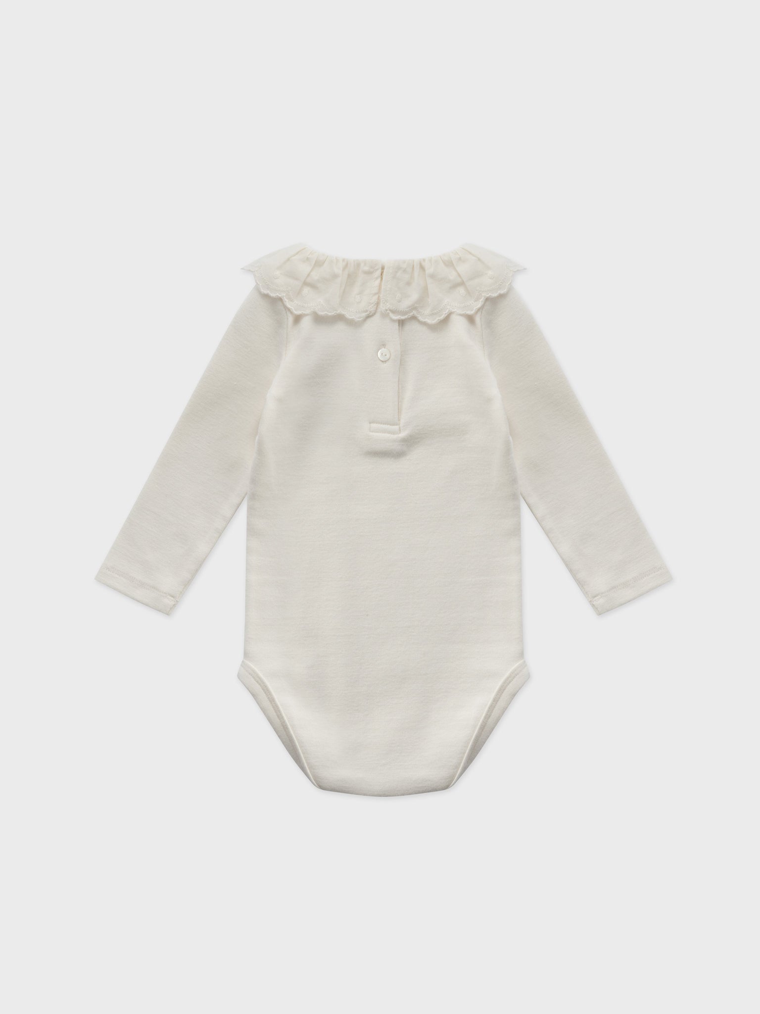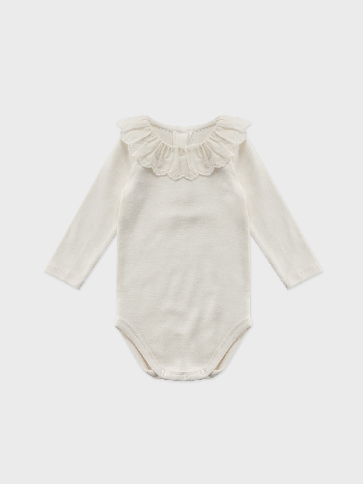 Long sleeve bodysuit with a lace collar. Its soft and stretchy fabric make it comfortable and ideal as innerwear under a romper or dress.