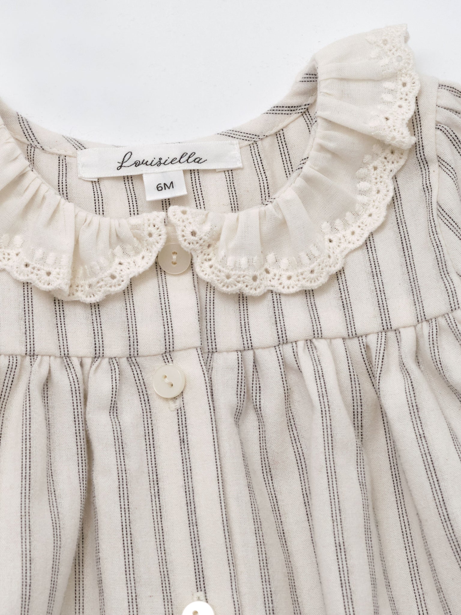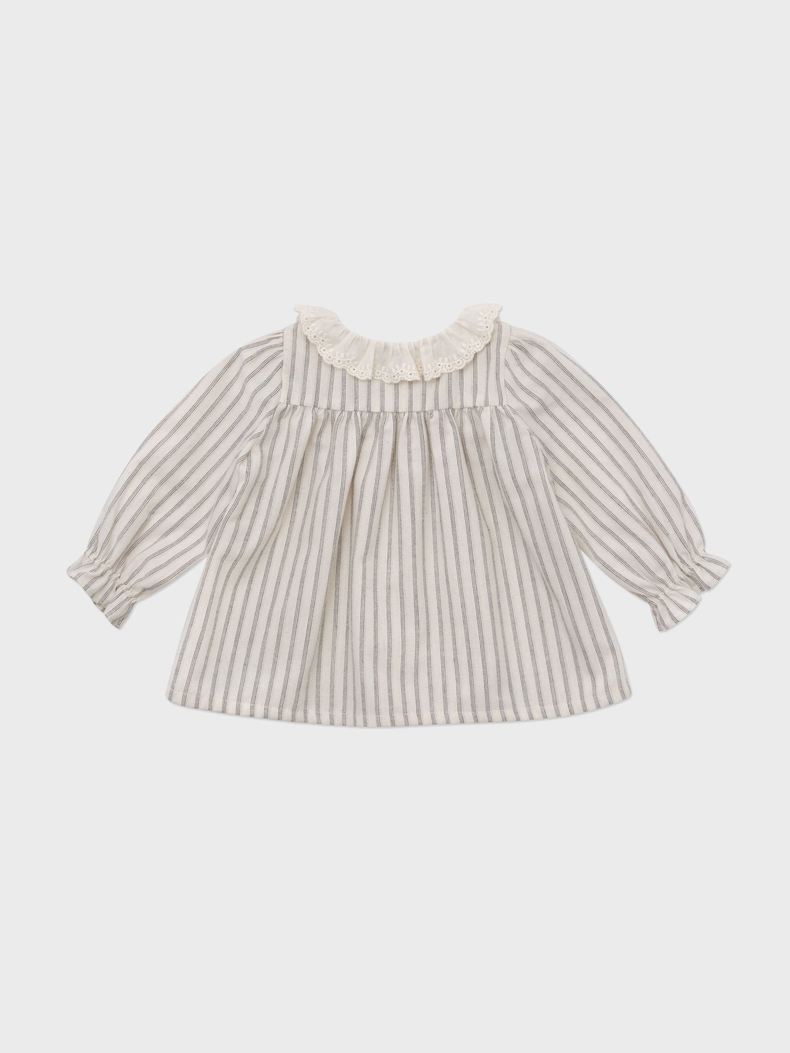 Our vintage-inspired baby blouse is crafted from in the soft embrace of cotton and adorned with a timeless navy pinstripe pattern. Its delicate lace collar and graceful A-line fit bestow a touch of femininity to the silhouette, capturing the essence of refined elegance. Elevate this pinstripe blouse with our Baby Artid Bloomer, creating a vintage ensemble that stands out with sophistication.