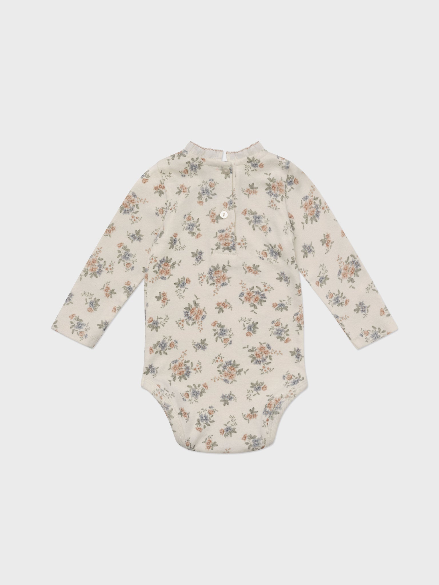 Louisiella's classic baby bodysuit, now elevated with new seasonal print. With its long sleeves and lace collar in our signature soft and strecthy cotton modal fabric blend, it is a staple of any baby girl's wardrobe.