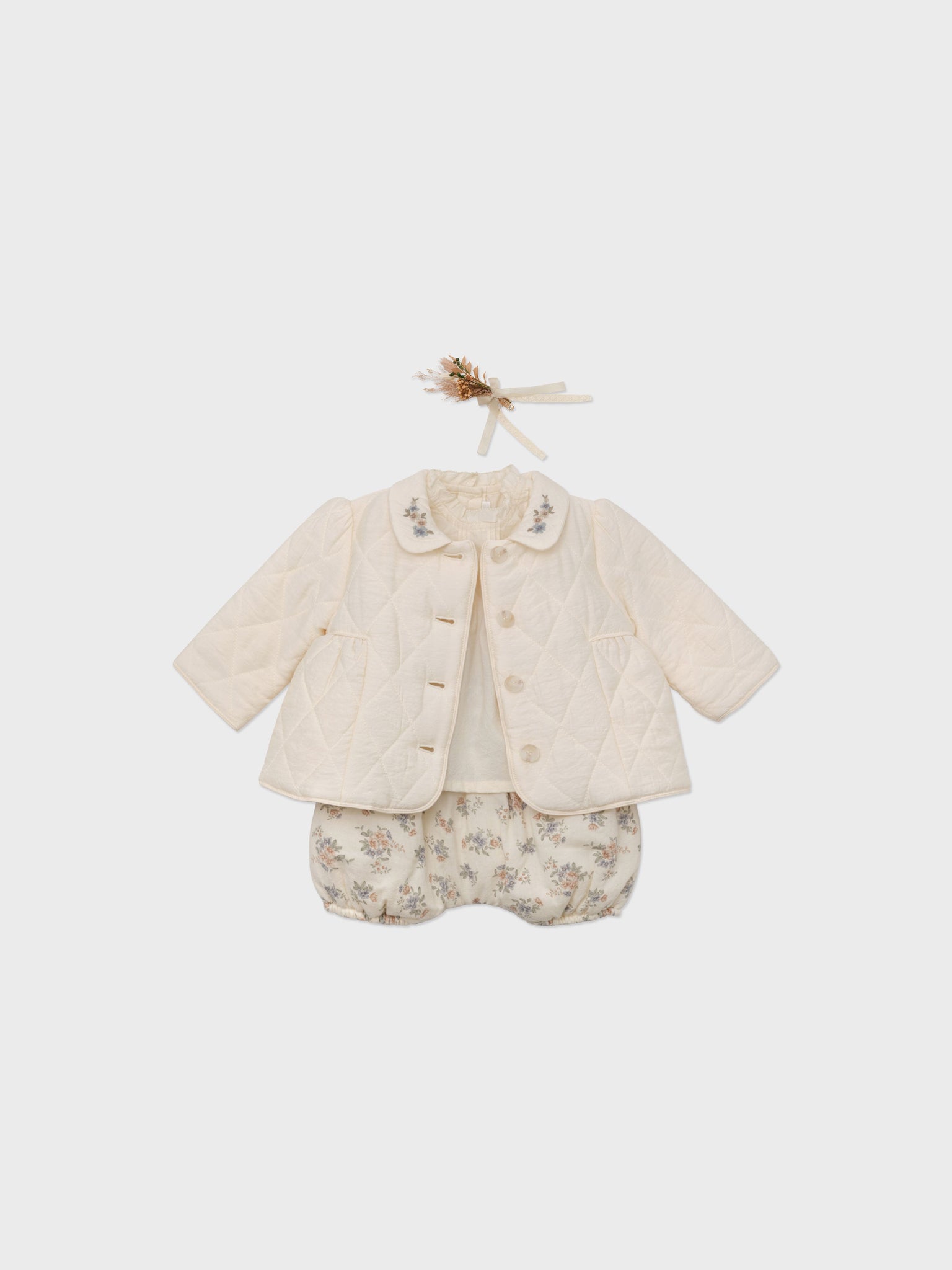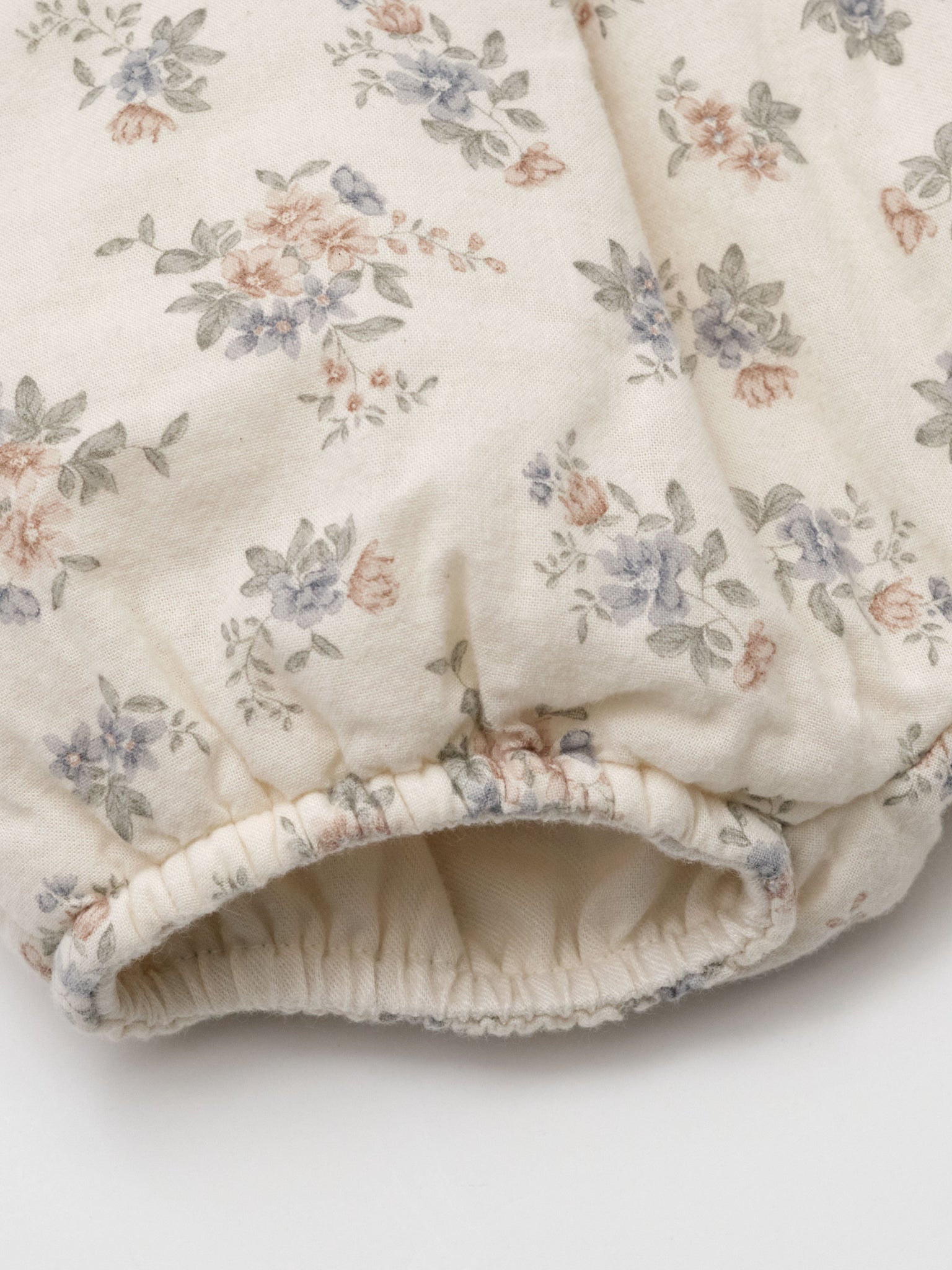 Lovely baby bloomer in Louisiella's latest floral print, a delightful hallmark of the season. With its fleece lining and 2oz cotton padding, it has a cute puffy fit while keeping your little one warm this winter. For a complete cozy look, pair it effortlessly with its matchingBaby Obnella Blouse.