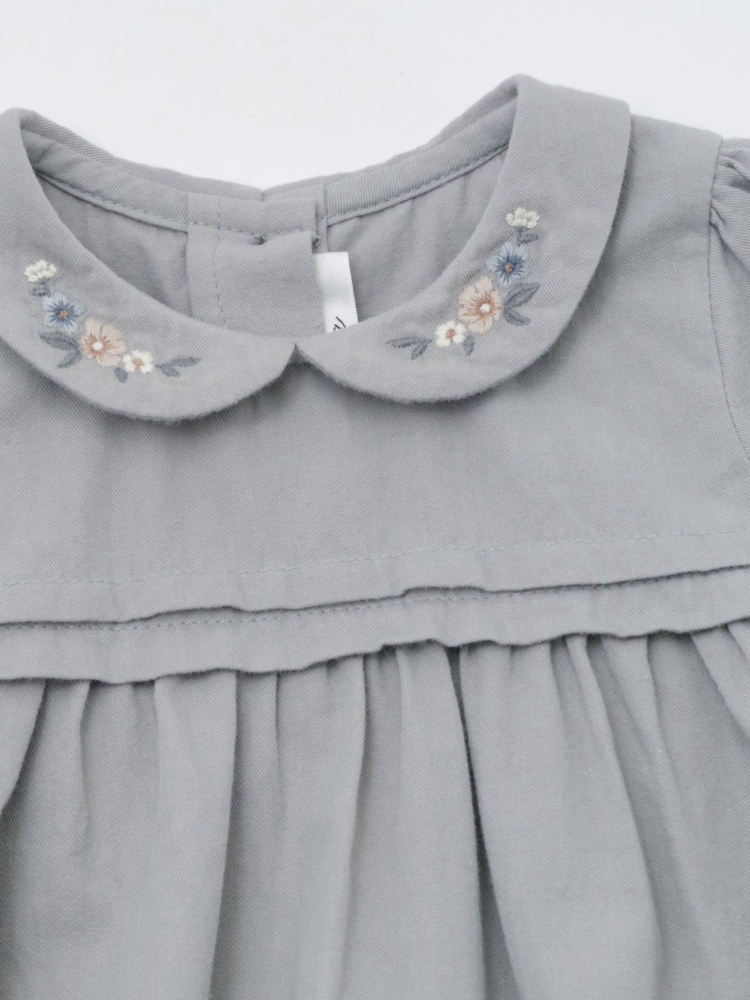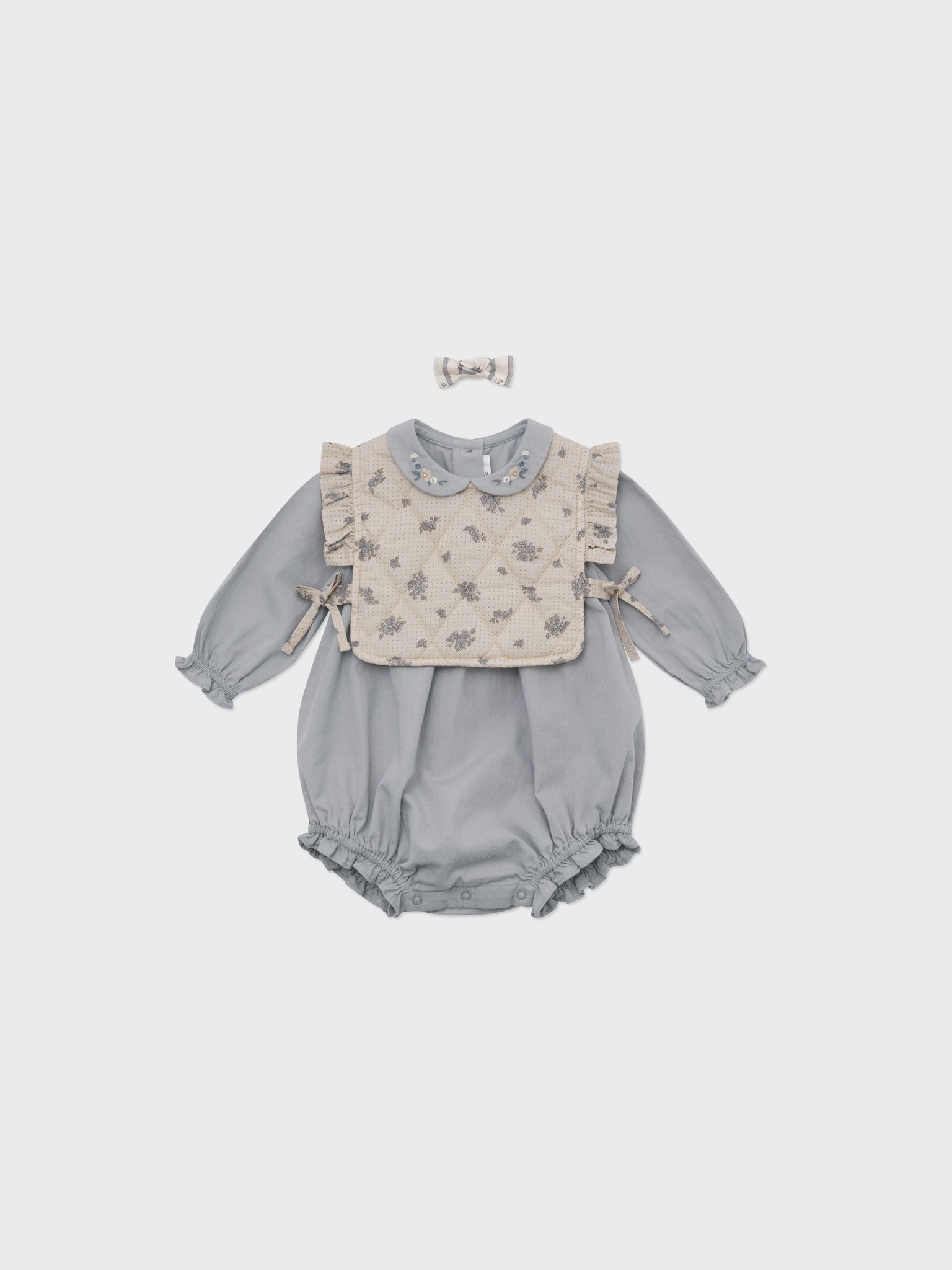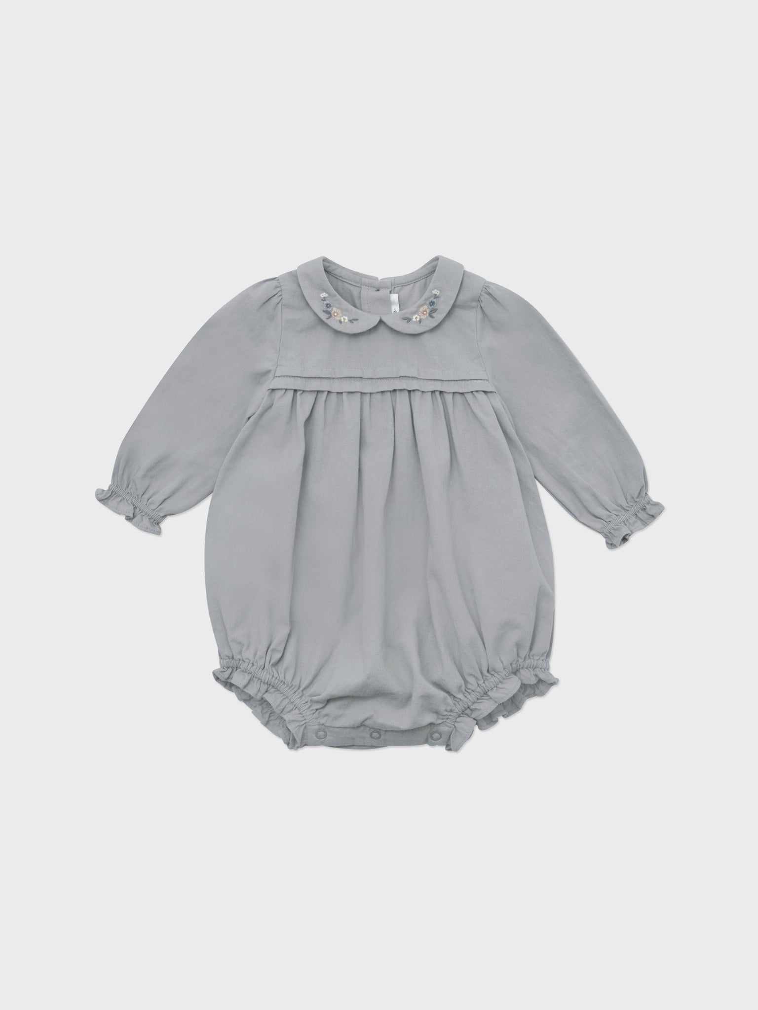 Designed in Louisiella's distinctive vintage aesthetic, this baby long-sleeve romper is the perfect going out choice, featuring an adorable petit collar with floral embroidery. Blue rompers like these exude refined sophistication, making them a timeless addition to your baby girl's ensemble.