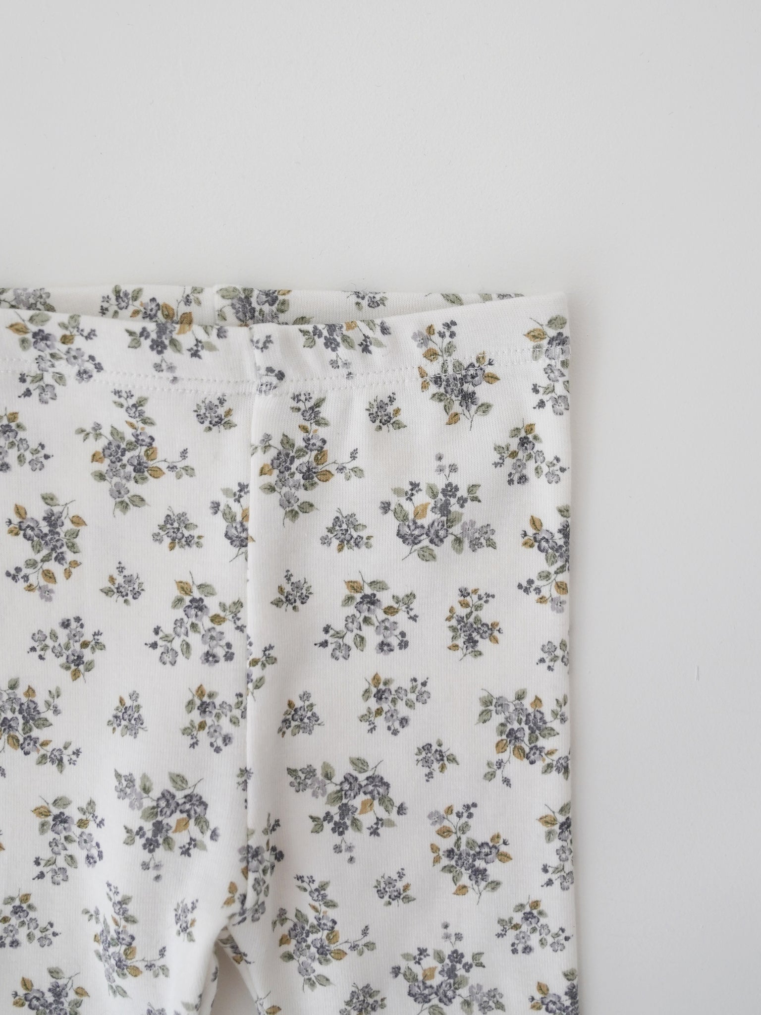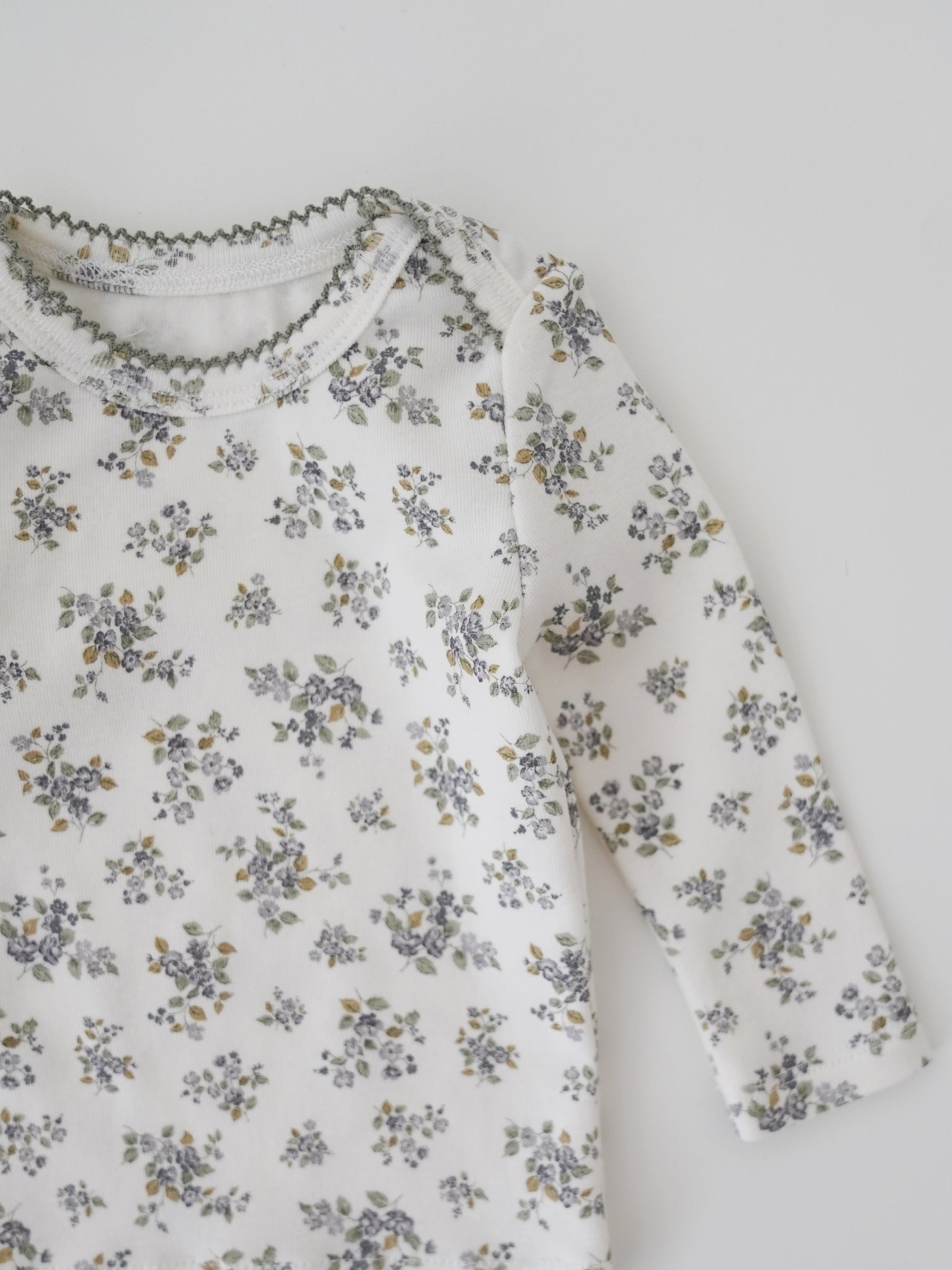 A soft baby pajama set in a vintage flower print unique to louisiella, made of a long sleeve top and leggings.