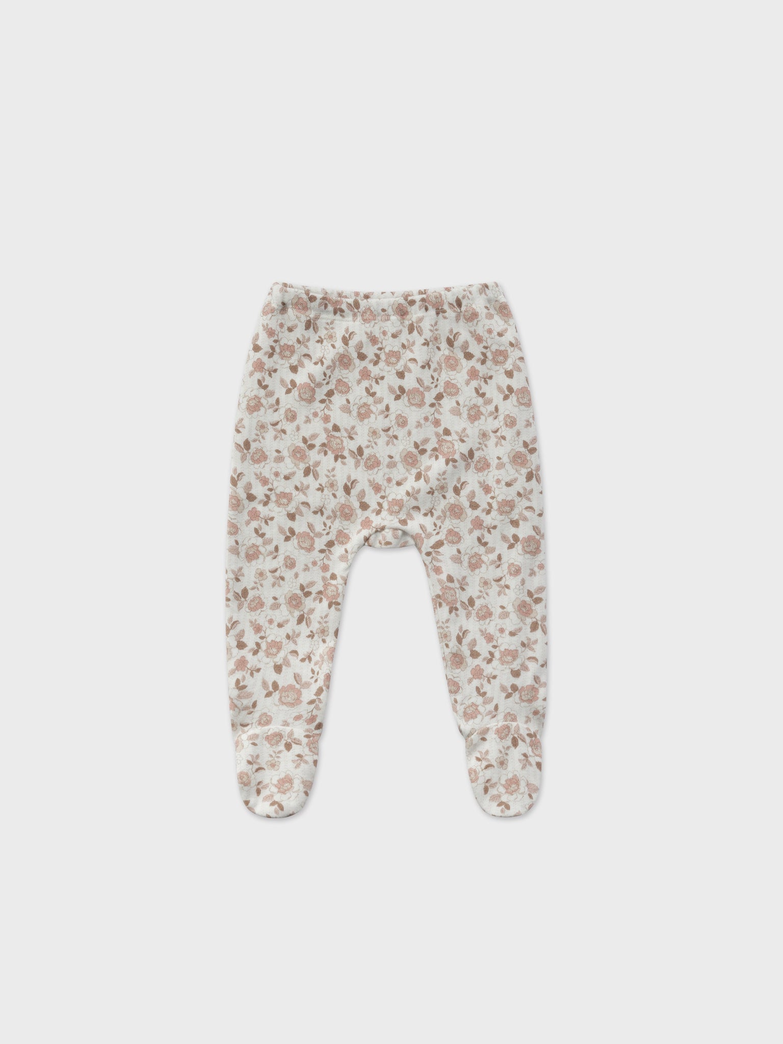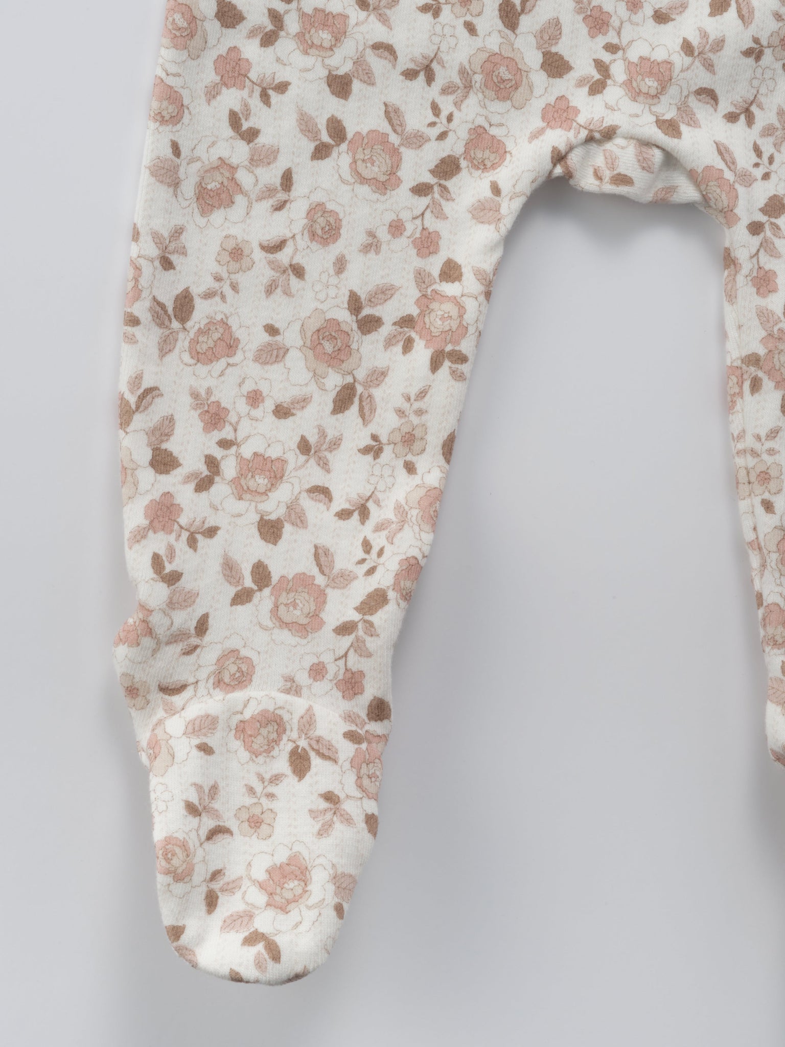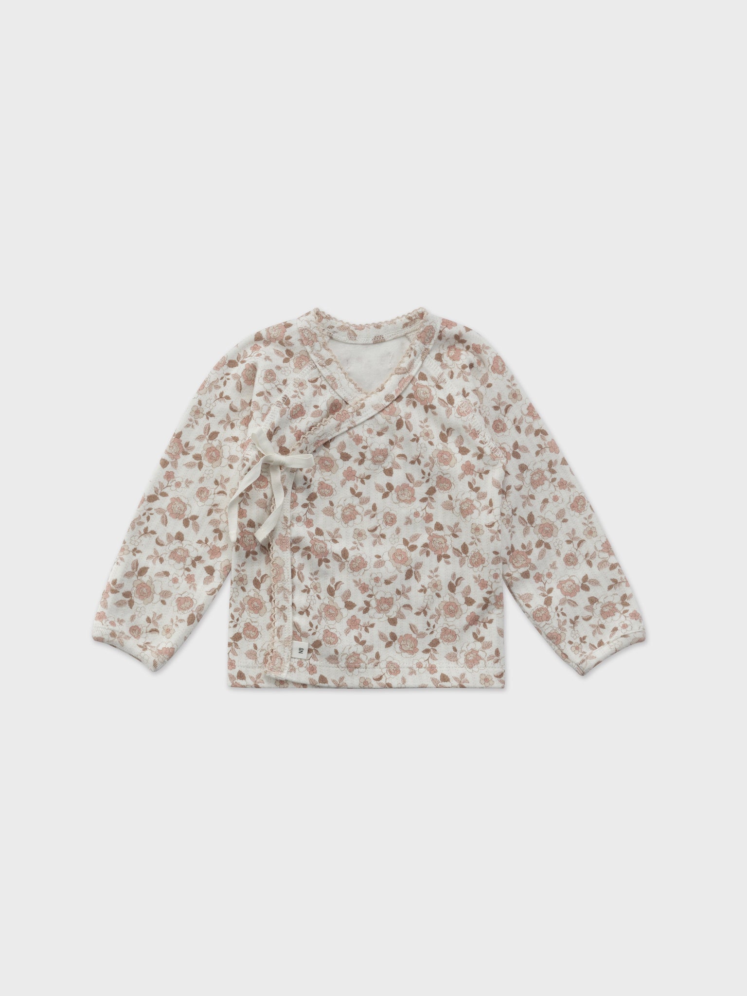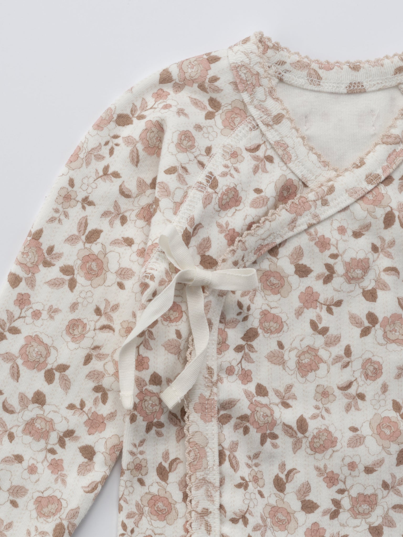 Soft and warm newborn pajama set in a vintage flower print unique to louisiella, made of a long sleeve wrapped top and footed leggings.